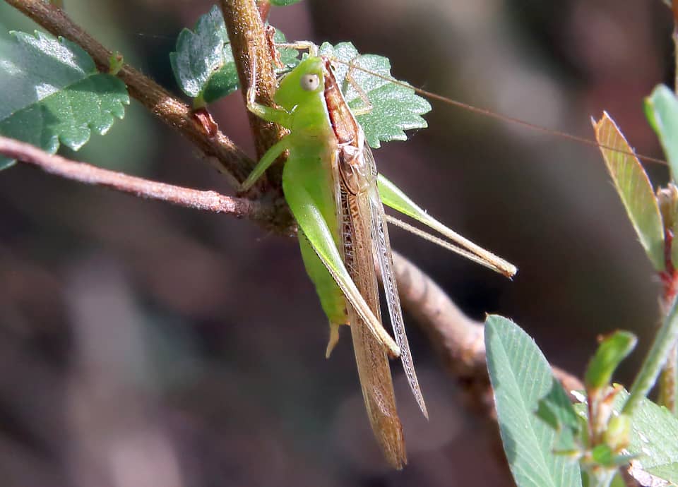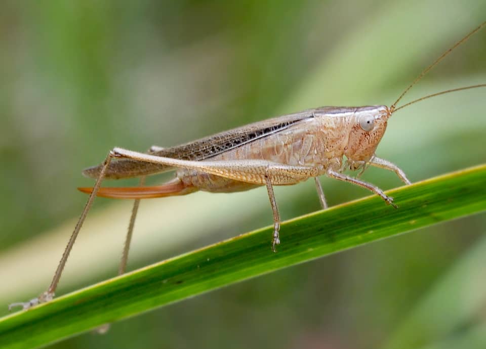 | ホシササキリは小型のキリギリスで、ササキリの中でも最も小さいと言われている。 イネ科植物が繁茂するところなら様々な環境で見られ、市街地近郊の公園でも見られる。 ホシササキリの分布域 ホシササキリはアフリカ南部やインド、東南アジアなどに広く分布している。 国内では本州から南に分布していて、沖縄地方でも見られる。 ホシササキリの大きさ・特徴 ホシササキリは、翅の先までだと21~27mm程の大きさがあるが、体長は13~17mm程で、国内で見られるササキリの仲間の中では最も小さいと言われている。 体は雌の方がやや大きく、腹部の先に長い産卵管をもっている。 この産卵管はよく目立ち、時には翅の後ろ端よりも長く伸びている。 また、孵化した幼虫は緑色をしているが、成長すると褐色のものと緑色をしたものが見られる。 しかし、いずれも前翅の色は褐色や淡褐色のような色で、側面の基部辺りに小さな黒い点列があるのが特徴になっている。 この点列が星のようにも見えることから名前が付けられているが、頭頂から前胸の背面にかけても翅と同じような色をしていて、背側は褐色のように見える。 また、頭頂から前胸の背面にかけての褐色部分は、ふつうは白っぽく縁どられている。 ホシササキリの生態・生活 ホシササキリは低地から丘陵地などにかけて生息していて、林縁や耕作地周辺、海岸近くや河川沿いの藪や茂み、寺社の境内や空き地など、様々な環境で見られる。 比較的乾燥した開けた環境を好み、草地などではふつうに見られ、市街地近郊の公園でも見られる。 成虫は主に8~11月頃にかけて見られるが、地域によっては6月頃から見られるようになり、南西諸島では1年を通して見られると言われている。 日中に活発に活動し、成虫・幼虫ともに主にイネ科植物の葉などを食べるが、小型昆虫の死骸なども食べる。 ホシササキリはイネ科植物がある様々な場所で見られ、しばしば茎につかまっているところが観察されるが、近づくと素早く茎の裏に回り込んで、姿を隠すようにする。 回り込んでみても、やはり身を隠すように移動し、飛んで逃げるときも、小さい体にもかかわらず、かなりの距離を飛翔する。 また、鳴き声は「ジー・ジー・ジー・・・」などのように聞こえるが、鳴き声は小さい。 雌はイネ科植物の葉の基部に卵を産み付け、暖地を省き、冬は卵で越冬するとされている。 ホシササキリについての参考・その他 ホシササキリはアフリカ南部やインド、東南アジアなどにも広く分布しているが、ホシササキリはイネ科植物を食べることから、インドなどではキビやトウモロコシに害を与える害虫とされている。 |