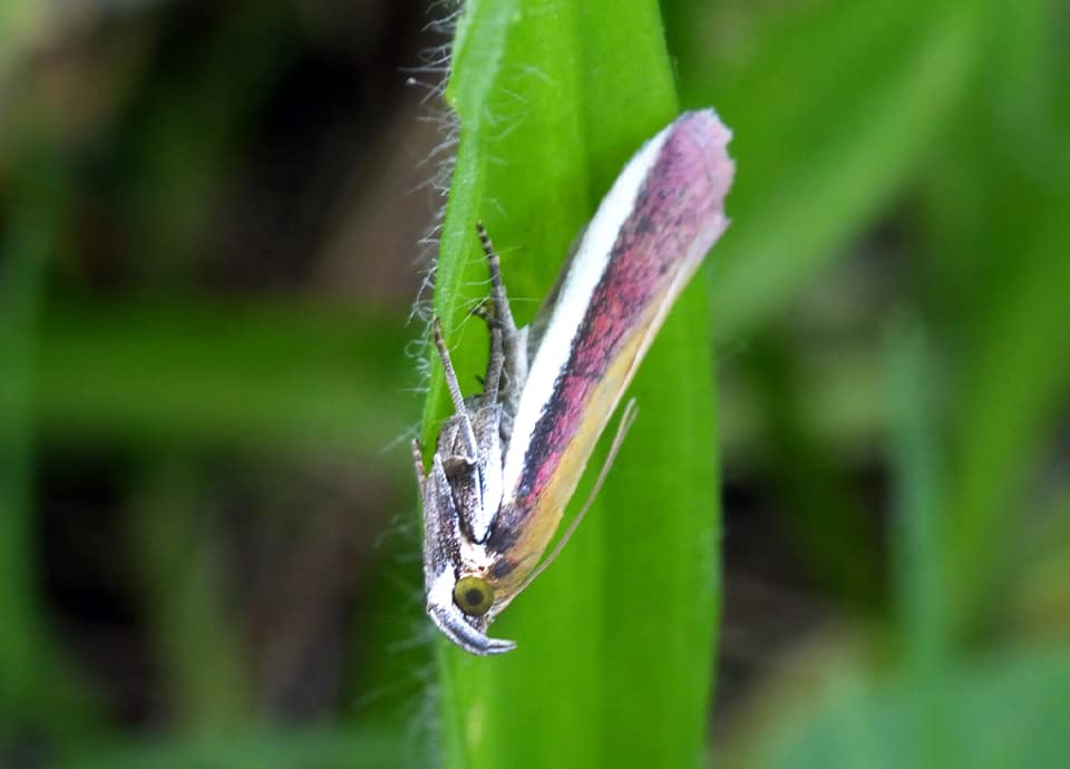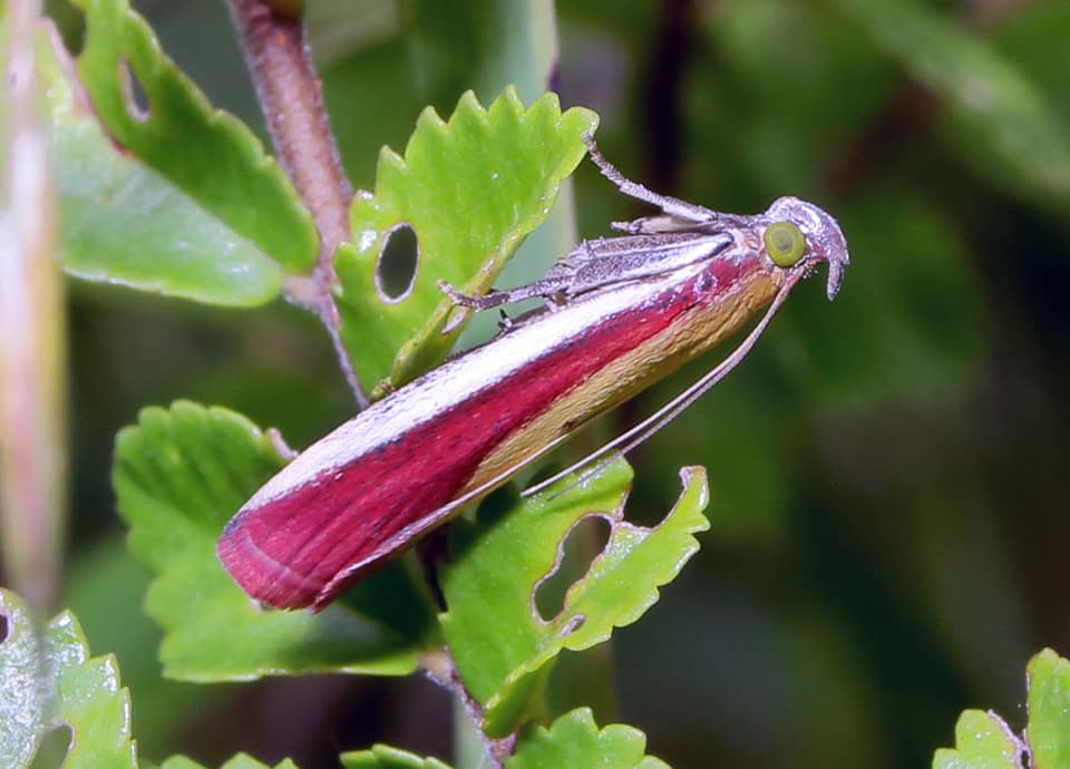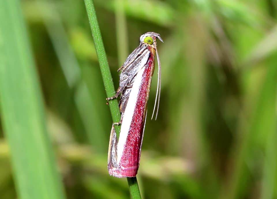 | アアカマダラメイガは国内各地に分布していて、草原や耕作地周辺などの開けた場所で多く見られる。 体は小さいが、歩いていると草の中から飛び出してくるので、案外見つけやすい。 アカマダラメイガの分布域 アカマダラメイガは北海道から九州、沖縄まで広く分布していて、草原などの開けた環境で見られる。 アカマダラメイガの大きさ・特徴 アカマダラメイガは前翅長(前翅の基部から先までの長さ)12mm程で、開帳は25mm程の長さがある。 前翅が紅色をしているのが特徴になっているが、前縁は白く、後縁は黄色い色をしている。 また、目は緑色をしているが、翅色には変化があり、暗い灰色のようなものも見られる。 アカマダラメイガの生態・生活 アカマダラメイガは低地から丘陵地にかけての草原などに生息しているが、林縁や耕作地周辺などにも生息している。 成虫は主に6〜9月頃にかけて見られ、開けた環境を好み、市街地近郊の公園などでも見られる。 昼間に活動すると言われているが、しばしば灯火にも寄ってくる。 草むらを歩いていると飛び出してきたりするが、日中に葉や茎にとまっている時には、触覚を背に沿うように後方へ伸ばしている。 赤っぽい色をしているにも関わらず、その様子は案外植物の茎のようにも見える。 また、飛んで逃げても遠くへは飛ばず、葉裏にとまることは少ないように思える。 幼虫はシロツメクサやミヤコグサなど、マメ科植物の葉を食べるが、成虫についてははっきりしない。 冬は幼虫で過ごすと言われている。 アカマダラメイガについてのその他・参考 アカマダラメイガはふつうに見られるが、国外でもインドからインドシナ半島、中国や朝鮮半島、台湾などにも分布していて、ロシア東部やヨーロッパにも分布している。 また、北海道での数は少ないとも言われている。 |