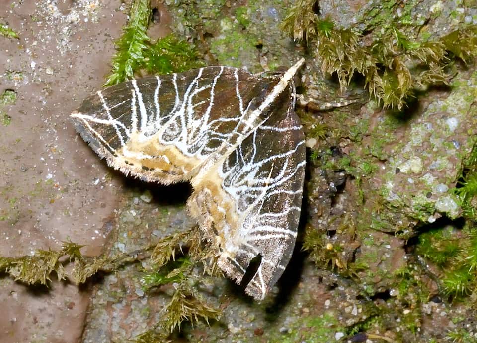 | セスジナミシャクは主に森林や疎林、耕作地周辺の雑木林などに生息している。 特徴のある翅の模様をしているが、比較的ふつうに見られ、市街地近郊の公園で観察できることもある。 セスジナミシャクの分布域 セスジナミシャクは本州や四国、九州に分布していて、伊豆大島や対馬、屋久島などの島嶼部にも分布している。 セスジナミシャクの大きさ・特徴 セスジナミシャクは前翅長(前翅の基部から先までの長さ)14〜17mm程度、開翅張は20〜28mm程で、雌の方が雄よりもやや大きい。 翅色は全体に暗褐色や黒褐色をしているが、はっきりとした網目模様や稲妻模様などに見える白っぽい筋があるのが特徴になっている。 また、名前のように、頭部から腹に向かってひと筋の白っぽい縦筋が見られるのも特徴になっている。 前翅の後方には褐色や淡褐色の斑があるが、この斑の色には変化があり、ほとんど白いものや、暗色で地の色と同じようなものも見られる。 セスジナミシャクの生態・生活 セスジナミシャクは低地から低山地にかけて生息していて、主に森林や疎林などで見られる。 湖畔林や耕作地周辺の雑木林でも見られ、樹木が多ければ市街地近郊の公園でも観察できる。 成虫は4〜10月頃にかけて現れるが、地域によっては11月頃まで見られる。 花の蜜を求めて夕暮れ時から活動するが、灯火にも寄ってくる。 また、昼間は休んでいて木にとまっていることが多いが、よく目立つような翅の模様も保護色になっていて、見落としてしまうことも多い。 幼虫はアケビやミツバアケビなどのアケビ科の葉を食べて成長するが、体は細長い緑色で、動かずにいると小さな枝か茎のように見える。 成長すると葉の隙間でサナギになり、冬はサナギで越冬する。 セスジナミシャクについてのその他・参考 セスジナミシャクは朝鮮半島や台湾にも分布しているが、国内で見られるものは基亜種で、台湾のものは別亜種とされている。 |