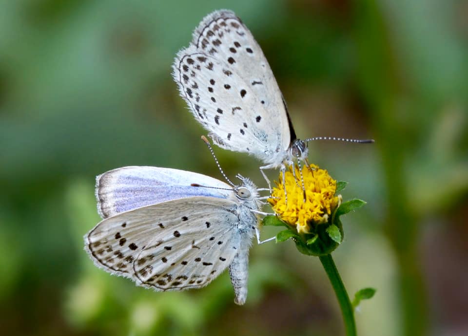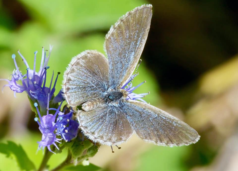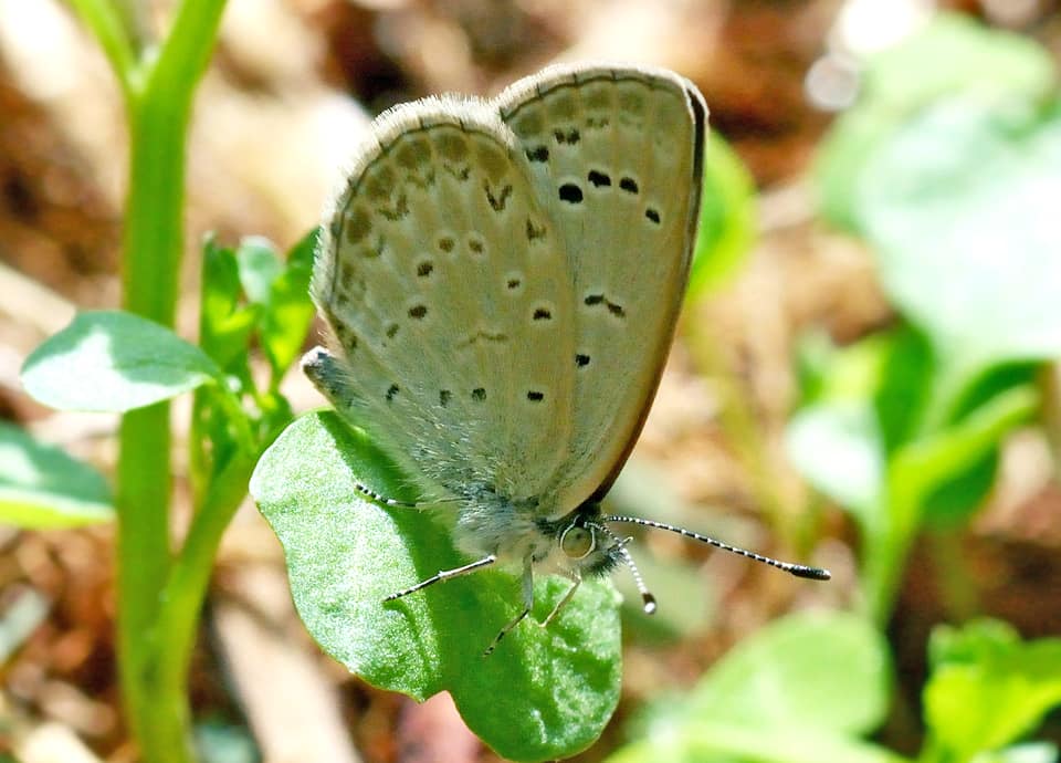 | ヤマトシジミはもっともよく見られるシジミチョウのひとつで、本州より南に分布している。 草地や雑木林、耕作地や庭先など、様々なところで見られる。 ヤマトシジミの分布域 ヤマトシジミはイランからインドを経て東アジアや東南アジアなどにかけて広く分布していて、台湾やフィリピンにも分布している。 国内でも本州より南に分布していて、シジミチョウの中でも最もよく見られるひとつになっている。 ヤマトシジミの大きさ・特徴 ヤマトシジミは、前翅の付け根から先までの長さ(前翅長)が12〜15mm程で、雌雄ともに翅の裏は同じ色をしている。 翅の裏は明るい灰色のような色で、暗褐色の黒っぽい斑が散在している。 前翅、後翅ともにオレンジ色などの斑は見られず、中央辺りに「く」の字や山型のようにも見える黒い斑がある。 また、翅の縁に沿っても暗色の斑が並んでいる。 翅の表側は雌雄でやや異なっていて、雄ではやや光沢のある青い色をしているが、雌では黒ずんだ色をしていて、春や秋にはやや青っぽくなる。 一見するとシルビアシジミによく似ているが、一般に、ヤマトシジミの後ろ翅の裏の「く」の字に見えるような斑の外側の斑は、円弧を描くように並んでいる。 これに対し、シルビアシジミの同じような位置にある斑は円弧になっておらず、中央辺りの斑も、ヤマトシジミで見られる「く」の字のようではなく、斑全体が太くなっている特徴などがある。