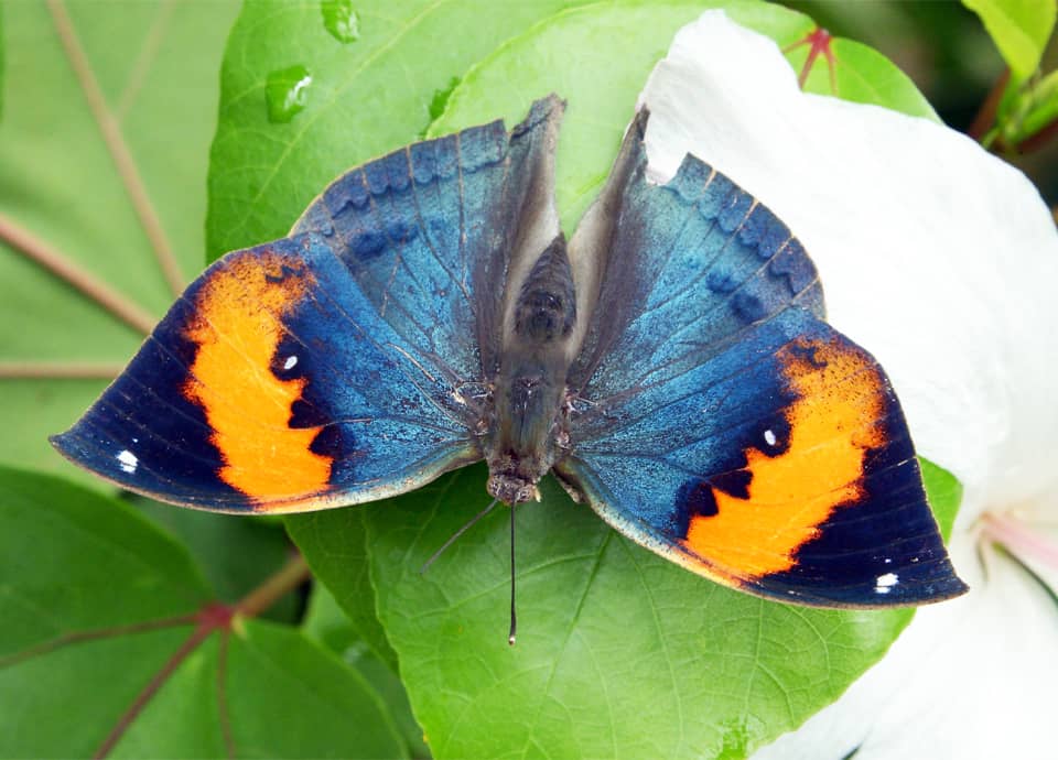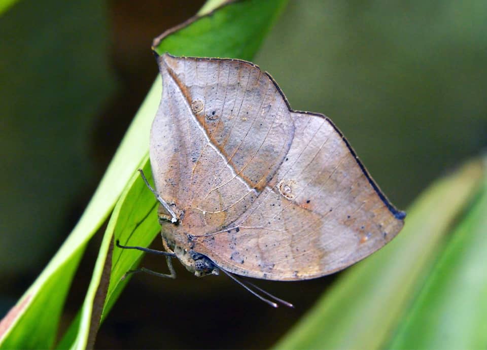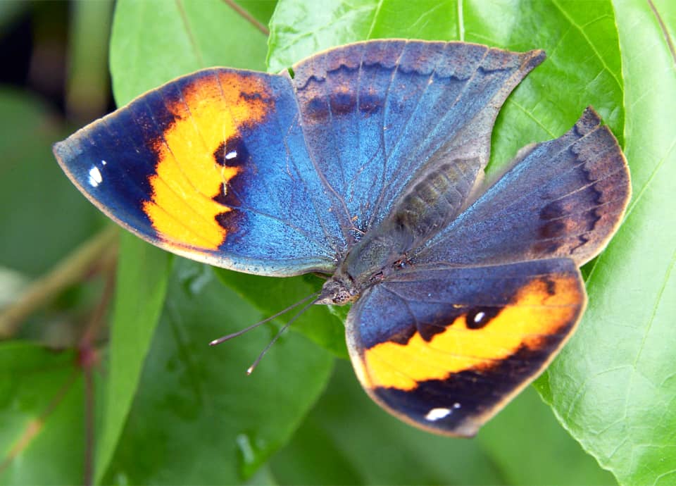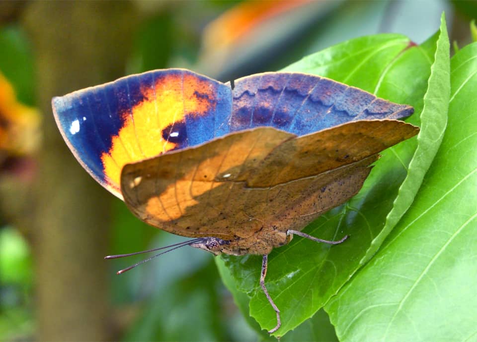 | コノハチョウはタテハチョウの仲間で、国内では沖縄諸島などに分布している。 翅の表は濃青色に黄色やオレンジ色の帯があるが、翅裏は枯れ葉によく似た色と模様をしている。 コノハチョウの分布域 コノハチョウはインド北部からインドシナ半島、中国や日本、台湾などに分布しているタテハチョウの仲間で、国内では沖縄諸島などに分布している。 コノハチョウの大きさ・特徴 コノハチョウは前翅長(前翅の基部から先までの長さ)が45〜50mmほどで、ツマムラサキマダラやリュウキュウアサギマダラなどと同じほどの大きさがある。 翅の表は深い青色や藍色で、前翅には鮮やかな黄色からオレンジ色の幅広い帯が見られる。 この色合いがコノハチョウの特徴になっているが、黄色やオレンジ色の帯を挟むように、小さな白斑があるのも特徴になっている。 翅の裏側も特徴的で、全体に褐色から淡褐色の帯模様か雲模様のようになっているが、前後の翅の中央辺りには暗色の筋が見られる。 前後翅ともに先が尖っているので、翅を閉じると枯れ葉に非常によく似ていて、その様子から「コノハ(チョウ)」とも名付けられている。 また、翅裏の模様は個体によってやや違っているが、いずれも木の葉によく擬態している。 コノハチョウの生態・生活 コノハチョウは低地から山地まで生息していて、森林や藪、その周辺などに生息している。 湿気の多い薄暗いような環境に多く、成虫は国内では年に数回ほど現れると言われている。 成虫はほぼ1年を通して見られるが、主に3〜11月頃にかけて多く見られる。 成虫は花を訪れることもあるが、ゴマダラチョウなどのように、主に樹液や熟した果実、落下果実などで吸汁し、獣糞などに集まることもある。 幼虫はキツネノマゴ科のオキナワスズムシソウやコダチスズムシソウ、オギノツメなどを食草としていて、冬は成虫で越冬する。 コノハチョウについての参考・その他 コノハチョウの分布域は広いが、国内での分布域は限られていることもあり、沖縄県では指定天然記念物に指定しているほか、環境省でも準絶滅危惧(NT)に指定している。 尚、コノハチョウには主に次のような亜種が知られている。 Kallima inachus inachus (インドからインドシナ半島北部、中国などに分布する基亜種) K. i. chinensis (中国) K. i. eucerca (台湾や日本) K. i. formosana (台湾) K. i. ramsayi (インド北東部など) K. i. siamensis (インドシナ半島など) |