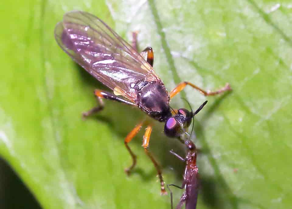 | ハラボソムシヒキは細身のムシヒキアブで、黒い腹部に黄色っぽい斑があるのが特徴になっている。 他のムシヒキアブと同様、さまざまな昆虫類を素早くとらえる。 ハラボソムシヒキの分布域 ハラボソムシヒキは本州や四国、九州などに分布している。 北海道にも分布するとも言われているが、これについてははっきりせず、国外の分布域についても分からなかった。 ハラボソムシヒキの大きさ・特徴 ハラボソムシヒキは体長9~11mm程で、全体にほっそりとして体つきをしている。 よく見られるシオヤアブなどに比べると、体はかなり小さく、ずっと華奢な体つきをしている。 全体に黒っぽい色をしているが、名前のように腹部は細く、腹部の第3~5節には黄色っぽい斑があるのが特徴になっている。 前足と中脚はオレンジ色のような色をしていて、後ろ脚は黒っぽいが、一部にオレンジ色のような斑があるのも特徴になっている。 また、触角は黒いが、複眼は紫色のような色をしている。 ハラボソムシヒキの生態・生活 ハラボソムシヒキは低地から山地まで生息していて、林縁や疎林、耕作地周辺などで多く見られる。 草地や寺社林、人家周辺でも見られ、公園で見られることもある。 成虫は5~9月頃にかけて見られ、ハエやアブ、ガなど、さまざまな小型昆虫を捕食する。 動きは敏捷で、開けた見通しのよい葉の上などにとまっていて、獲物が近づくと素早く飛んでとらえてしまう。 幼虫は土の中や朽木の内で過ごしていて、小型の昆虫類やミミズ、ワラジムシなど土壌性の動物から吸汁する。 冬は成虫、或いは幼虫で越冬すると言われていて、冬の越冬形態についてははっきりしない。 ハラボソムシヒキについての参考・その他 ハラボソムシヒキは、一見するとハチの仲間のようにも見えるが、ハエの仲間なので、人を刺したりするようなことはない。 また、ふつうは雄よりも雌の方がやや大きく、腹部も太くなっている。 |