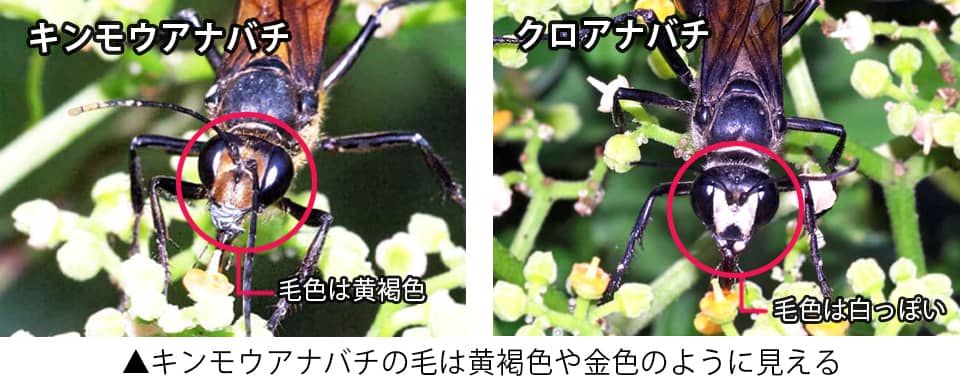 | キンモウアナバチはアナバチの中では大型で、20~30mmほどの大きさがある。 名前のように、腹部の基部や頭部には黄褐色の毛が密生しているのが特徴になっている。 キンモウアナバチの分布域 キンモウアナバチはインドからインドシナ半島を経て、中国南部や日本、台湾などに広く分布しているほか、マレー半島やインドネシアなとにも分布している。 国内でも本州から九州、沖縄地方まで分布している。 キンモウアナバチの大きさ・特徴 キンモウアナバチは体長20~30mm程で、コガタスズメバチほどの大きさがある。 アナバチの中では大型で、体や脚は黒く、翅は褐色や黄褐色をしている。 腹部の基部(細くくびれている前の辺り)には黄褐色や金色に見える毛が密生しているのが特徴になっていて、この毛の色から「キンモウ」の名前が付けられているが、左右の複眼の間(頭楯)にも同色の毛が生えていて、大顎は大きい。 キンモウアナバチは、一見するとクロアナバチによく似ているが、クロアナバチに見られる毛は白や銀色のような色をしている。