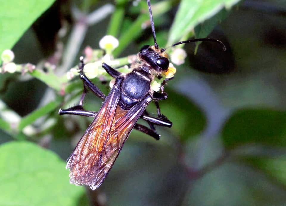 キンモウアナバチの生態・生活 キンモウアナバチは低地から低山地にかけて生息していて、林縁や草原、耕作地周辺などで見られる。 また、河川沿いの雑木林や藪、海浜周辺などのほか、植物がまばらに生える空き地などにも生息していて、公園や校庭、寺社境内なども見られる。 成虫は主に5~10月頃にかけて見られ、さまざまな花の蜜や花粉に集まり、クロアナバチと同所的に見られることもある。 雌は地面に穴を掘って巣をつくるが、巣は深く掘られ、幾つかの育室がつくられる。 しかし、クロアナバチのように、巣穴近くに偽の穴が掘られるようなことはない。 一方、営巣に適した場所では、周辺に幾つかの別の巣がつくられることがある。 雌はツユムシやクダマキモドキなどのキリギリス類をとらえて麻酔し、巣に運び込んで卵を産み付ける。 巣穴は最後の獲物を運び込んだのちに塞がれ、孵化した幼虫はそれらの餌を食べて成長する。 冬は成虫のまま越冬するとも、幼虫で越冬するとも言われているようで、はっきりしたことは分からない。 キンモウアナバチの参考・その他 キンモウアナバチは、以前は本州南部までに分布すると言われていたが、近年は分布域を北へ広げ、関東地方辺りでも見られる。 また、キンモウアナバチは分布域が広いこともあり、幾つかの亜種が知られているようだが、国内に分布しているものは亜種・Sphex diabolicus flammitrichus と言われている。 |
