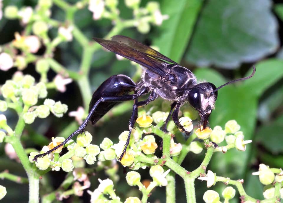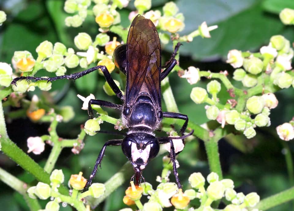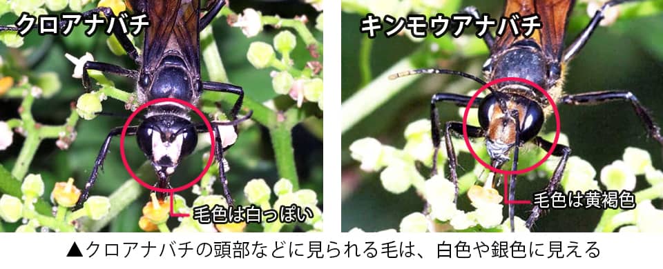 | クロアナバチは国内に広く分布しているアナバチの仲間で、名前のように、全体に黒い色をしている。 雌はキリギリス類などに卵を産み付け、孵化した幼虫はそれらの昆虫を食べて成長する。 クロアナバチの分布域 クロアナバチは、インドからインドシナ半島を経て、中国や朝鮮半島、日本や台湾などにかけて分布している。 国内でも北海道から九州、沖縄地方まで広く分布していて、マレー半島や東南アジアなどにも分布している。 クロアナバチの大きさ・特徴 クロアナバチは体長25~30mm程で、名前のように、体は光沢のある黒色をしている。 翅は半透明の暗褐色で、脚も黒い色をしているが、腹部の基部(細くくびれている前の辺り)には白色や銀色に見える毛が密生しているのが特徴になっている。 また、左右の複眼の間(頭楯)にも同色の毛が生えていて、大顎は大きい。 クロアナバチは一見するとキンモウアナバチとは大変よく似ているが、キンモウアナバチの頭部などに見られる毛は黄褐色や金色をしている。