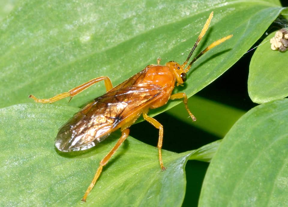 | チャイロハバチは国内に広く分布しているハバチの仲間で、全体に鮮やかなオレンジ色をしている。 低地から山地まで生息していて、市街地近郊の公園でも見ることができる。 チャイロハバチの分布域 チャイロハバチの国外での分布域は分からないが、国内では北海道から九州、南西諸島まで広く分布している。 チャイロハバチの大きさ・特徴 チャイロハバチは体長10~11mm程で、全体に鮮やかなオレンジ色をしているのが特徴になっている。 複眼は黒いが、脚もオレンジ色で、翅には暗色の斑が見られる。 また、触角の基部はオレンジ色をしているが、途中の第3~5節は黒っぽく、 その先が黄色い色をしているのも特徴になっている。 「チャイロ」と名前に付いているが、全体に鮮やかで、緑の葉上にいるとよく目立つ。 チャイロハバチの生態・生活 チャイロハバチは低地から山地にかけて見られ、疎林やその周辺、草地や藪などのほか、耕作地周辺などに生息している。 幼虫はアカネ科のヘクソカズラなどを食草としているとされているが、ヘクソカズラは陽当たりのよい場所ならさまざまな場所に自生しているので、それらがあれば市街地近郊の公園でも見ることができる。 成虫は、多くの地域で年に2回ほど現れ、主に5~10月頃にかけて見られるが、地域によっては4~11月頃まで観察できる。 卵は食草の茎の中などに産み付けられ、孵化した幼虫はそれらの葉を食べて成長する。 しかし、成虫iについては、小型の昆虫類などを食べるのか、ほとんど餌を獲らないのかなど、詳しい様子は分かっていないようである。 また、チャイロハバチは雌雄が交尾せず、雌によって単為生殖が行われるとも言われている。 これはダイミョウキマダラハナバチなどと同じで、チャイロハバチにも、ふつうは雄は見られないとも言われている。 冬は幼虫で過ごすと考えられていて、土中でマユをつくり、その中でサナギなり、その後に羽化して成虫となって現れる。 チャイロハバチについての参考・その他 チャイロハバチの詳しい生態などは分からないが、他のハバチと同様、人を刺すことはない。 |