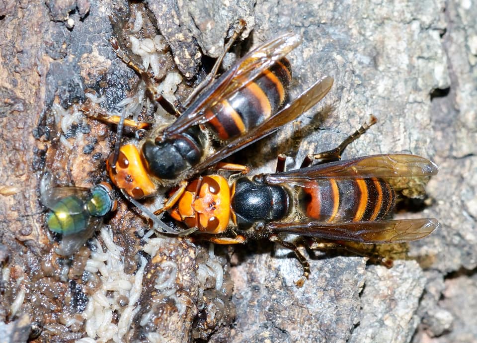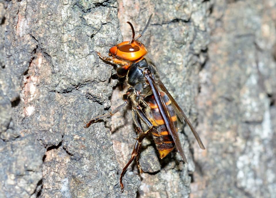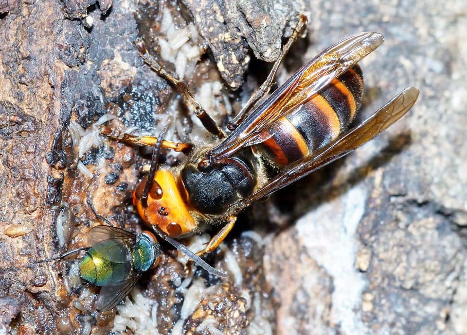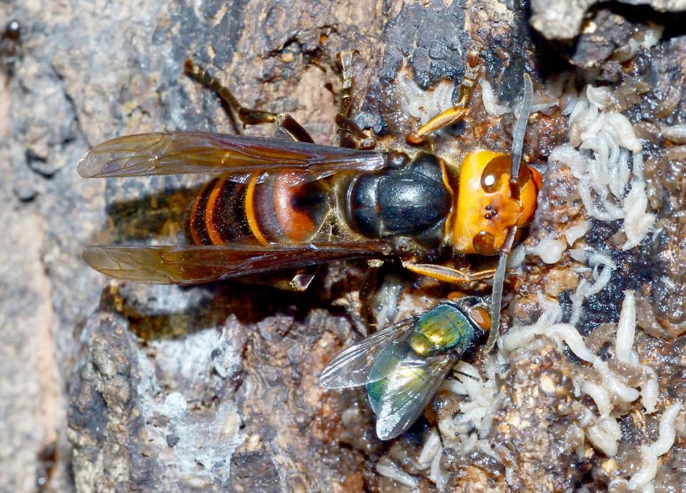 | コガタスズメバチは本州から沖縄地方まで分布していて、人の生活環境にもよく適応している。 市街地近郊の公園にも生息していて、時には庭木や生け垣などに巣をつくることもある。 コガタスズメバチの分布域 コガタスズメバチは、インドからインドシナ半島のほか、ロシア極東地方から中国、朝鮮半島、日本や台湾など、南アジアから東アジアなどに広く分布していて、マレー半島やインドネシアなどの東南アジアまで分布している。 国内では本州より南に分布していて、沖縄地方まで分布しているが、コガタスズメバチには亜種が多く、国内で見られるものも、本州から屋久島や種子島辺りまでのものは亜種・Vespa analis insularis、奄美大島から沖縄本島辺りまでのものはV. a. eisa、石垣島や西表島などの八重山諸島に生息しているものはV. a. nagatomiiとされている。 コガタスズメバチの大きさ・特徴 コガタスズメバチは女王蜂で30~35mm程度、働き蜂で20~25mm程で、オオスズメバチに比べると体は小さいが、中には体長30mm程の大きな働きバチも見られる。 体色は、頭部は黄色く、胸は黒くて斑などは見られない。 腹部には黒と赤褐色の様な縞帯が見られ、後端は黄色で終わっている。 一見するとオオスズメバチに似ているが、腹部に見られる帯模様は、オオスズメバチでは二本目の帯か細くて筋のようになっているが、コガタスズメバチでは太く、全体に同じ程度の幅をしているのが特徴になっている。 また、コガタスズメバチの頭楯(触角の前の部分)の下部中央には三つ(見ようによってはふたつ)の弱い突出があるが、オオスズメバチの頭楯中央にはふたつのはっきりとした突出が見られる。 コガタスズメバチの生態・生活 コガタスズメバチは低地から低山地にかけて生息していて、疎林やその周辺などで見られるが、人の生活圏にもよく適応していて、耕作地周辺や市街地近郊の公園にも生息しているほか、庭木に巣をつくることもある。 成虫は4~11月頃にかけて現れ、樹液に集まったりするほか、アブラムシやキジラミなどが出す甘い汁を舐めたりするほか、幼虫の出す液汁なども舐めとったりする。 花の蜜を舐めたりすることもあが、コガタスズメバチが花に来るときは、花に寄ってくる他の昆虫をとらえることが多いと言われている。 また、幼虫の餌としてさまざまな昆虫類などをとらえるが、時にはアシナガバチなどの巣を襲い、その幼虫やサナギなどをとらえることもある。 成虫は4~11月頃にかけて現れ、4月頃には女王バチが活動をはじめ、5月頃には単独で巣をつくりはじめる。 巣は茂みの中の木の枝などにつくられるが、しばしば庭木や生け垣の茂み、屋根のひさし部分やガレージの屋根などにつくられることもある。 巣材は樹皮や枯木などで、作りはじめられたころの巣は茶碗を伏せたような形をしているが、やがてはボール状になって下部には筒のようなものが伸びていて、徳利を逆さまにしたような特徴のある形になる。 成虫はとらえた昆虫を肉団子にしたもの幼虫に与え、幼虫はそれを食べて成長する。 6月を過ぎるころには働きバチも活動をはじめるようになり、この時期には筒のような部分は短くなり、巣はボール状の形になっていて、巣の中には200~300匹ほどの働きバチがいる。 8~10月頃にはもっとも活発に活動し、10月頃になると新しい女王バチと雄が羽化し、冬は新しい女王バチが越冬する。 コガタスズメバチの参考・その他 コガタスズメバチは建物や庭木にも巣をつくることから、時には知らずに触ったりして刺されることがある。 しかし、刺激を与えたり巣に近づいたりしなけば、向かってくるようなことはない。 但し、コガタスズメバチは、花などで採餌している時などはオオスズメバチも追い払うほどなので、注意するにこしたことはない。 尚、コガタスズメバチは分布域が広く、国外では次のような亜種が知られている。 Vespa analis analis ジャワ島西部に分布する基亜種 V. a. nigrans インドやネパールからインドシナ半島やマレーシア、中国南部や台湾など V. a. parallela ロシア極東地方や中国北部、朝鮮半島など V. a. tyrannica シンガポール V. a. tenebrosa バリ島やジャワ島東部 |