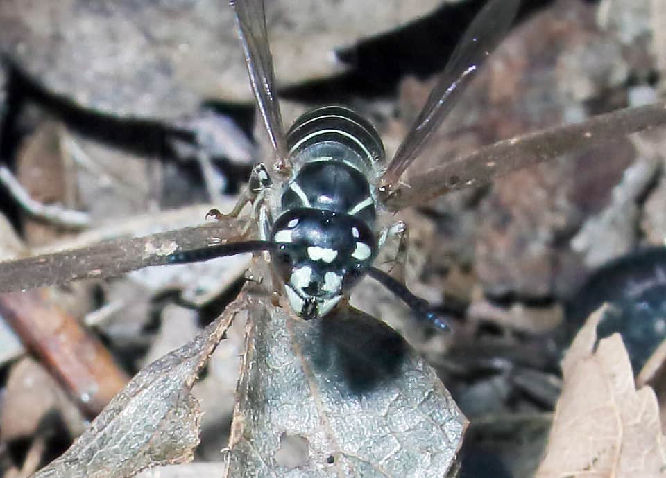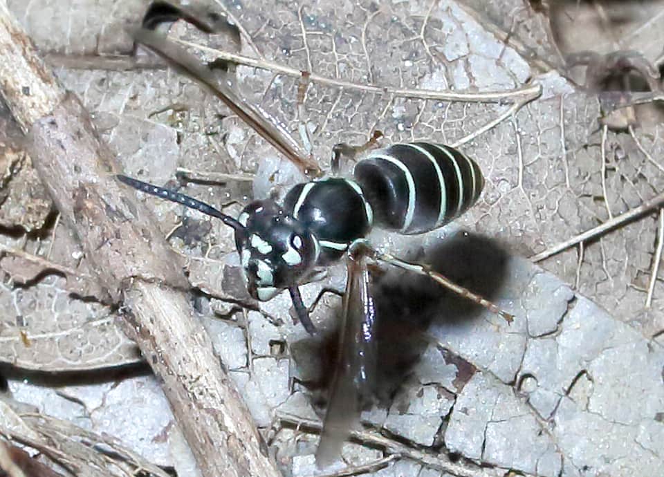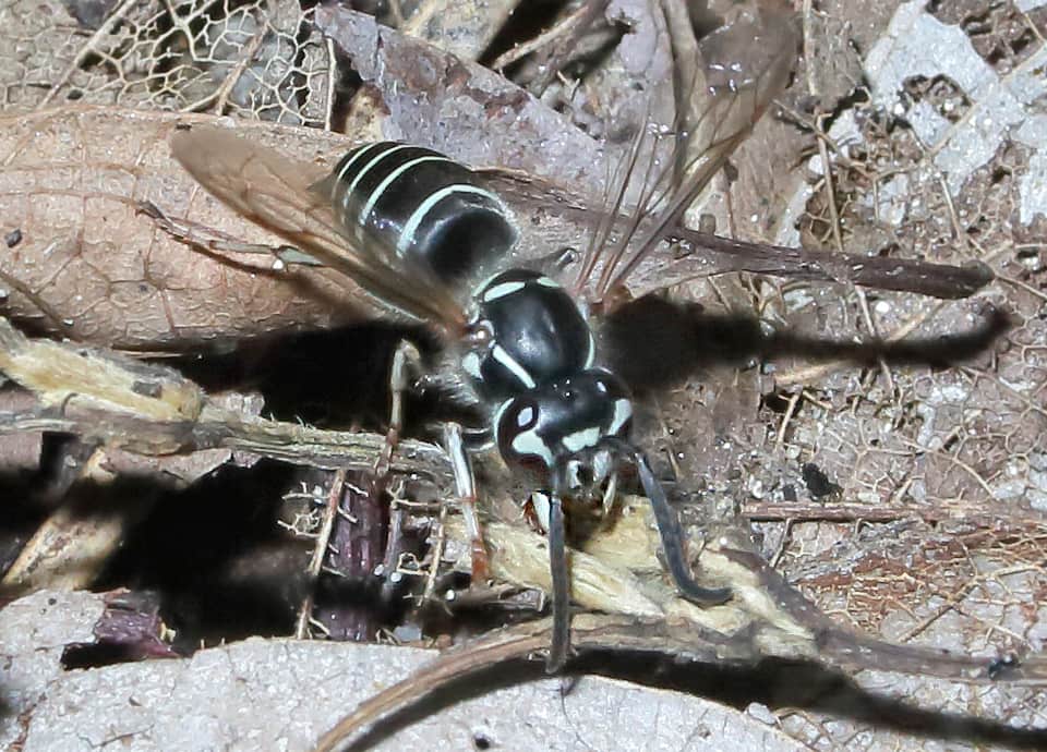 | クロスズメバチは国内で広く見られ、体は黒いが、頭部から腹部まで、白っぽい斑や帯が見られる。 観察期間は長く、疎林や雑木林、その周辺などに生息している。 クロスズメバチの分布域 クロスズメバチは日本や東アジアに分布しているスズメバチの仲間で、国内では北海道から本州、四国。九州に分布している。 クロスズメバチの大きさ・特徴 クロスズメバチは体長10~18mm程度で、雌の働きバチで10~12mm程の大きさがある。 雄の体長は12~14mm程で、女王バチがもっとも大きく、15mm程の大きさはある。 体は全体に黒く、青味のある白っぽい斑が胸の背側にあり、腹部にも同色の帯があるのが特徴になっている。 また、顔にも特徴的が斑があり、複眼の内側にも斑が見られるほか、脚にも同色の部分が多く見られる。 一見すると、シダクロスズメバチとは大変よく似ているが、複眼の内側にある斑を見ると、クロスズメバチでは半月状のように広がっているが、シダクロスズメバチでは、三日月形のように大きく湾曲しているなどの違いが見られる。 クロスズメバチの生態・生活 クロスズメバチは低地から山地まで生息していて、疎林やその周辺、草原や河川沿いの雑木林などで見られるが、耕作地周辺や公園で見られることもある。 成虫は4~11月頃にかけて現れるが、地域などによっては3~12月頃まで見られ、観察期間は長い。 成虫はさまざまな花の蜜や樹液、果汁などを摂取し、幼虫は、成虫がとらえたハエなどの小型昆虫類やクモ類などを肉団子にしたものを与えられる。 巣は土の中や木の根元などにつくられるが、時には屋根裏や樹洞などに営巣することもある。 冬は雌の成虫が越冬し、樹皮の間や朽ち木の中などで過ごすが、落ち葉の下や土の中でも越冬すると言われている。 冬を越した女王バチは、翌年の春になると活動をはじめ、最初は単独で巣をつくりはじめる。 その後、雌の働きバチが6月頃から現れるようになり、この頃から巣はより大きくなっていく。 雄や新しい女王バチは10月頃から見られるが、雌は多くの雄と交尾したのち、越冬に入り、他のものは死滅してしまう。 クロスズメバチについての参考・その他 クロスズメバチは比較的おとなしく、巣にやや近づいても向って来るようなことはほとんどないが、無暗に刺激したりすると刺されこともあるので、注意する必要がある。 また、クロスズメバチの幼虫は佃煮やふりかけなどに加工され、食用に利用している地域もある。 尚、クロスズメバチは朝鮮半島やロシア沿海地方などにも分布していて、基亜種・V. f. flaviceps と V. f. lewisii の2亜種が知られているが、詳しい分布域などは分からなかった。 |