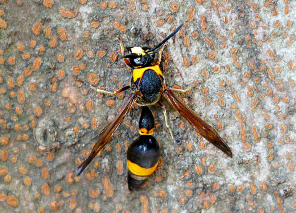 | スズバチは国内各地で広く見られ、黒い体にはっきりとした橙色の斑が見られる。 所謂トックリバチの仲間で、腹部は徳利のような形をしている。 スズバチの分布域 スズバチは中国や朝鮮半島、日本や台湾などに分布していて、国内では北海道から九州、沖縄地方まで広く分布している。 スズバチの大きさ・特徴 スズバチは体長は20~30mm程で、体は雌の方が雄よりもやや大きい。 全体に黒い色をしているが、腹部第一節の後方には橙色の細い帯とふたつに見える同色の斑があるのが特徴になっている。 第二節には太い橙色の帯があるのも特徴になっているが、胸の背側にも同色の斑がある。 また、頭部(頭楯)にも同色の斑が見られるが、雄ではやや淡い色をしている。 スズバチの生態・生活 スズバチは低地から低山地かけて多く見られ、疎林やその周辺、河川沿いの雑木林や耕作地周辺などに生息しているが、校庭や市街地近郊の公園でも見られる。 成虫は主に7~9月頃にかけて見られるが、地域などによっては5~10月頃まで観察できる。 単独で生活していて、成虫はさまざまな花を訪れ花蜜などを摂取する。 巣は木の枝や岩の割れ目などに壺状のものをつくるが、しばしば民家の軒下や壁などに巣をつくることもある。 巣は細くて細い枝や泥などを用いてつくられ、巣ができると、成虫は卵を産み、チョウ類などの幼虫を運び入れる。 その後入り口が塞がれるが、ひとつの巣にはひとつの卵が産みつけられ、孵化した幼虫は運び込まれたイモムシ類を餌として成長する。 スズバチはこのような巣を数個から十個ほどまとめてつくるが、更にその上から全体を泥などで上塗りして仕上げる。 また、木の枝などに巣がつくられると、形は大きな鈴のようにも見えるので、その様子から「スズバチ」と名前が付けられているのだろう。 はっきりとした越冬の様子は分からないが、ドロバチの仲間は幼虫で冬を越すので、スズバチも同じように幼虫で越冬するのだろう。 スズバチについての参考・その他 スズバチはスズメバチの中でも攻撃性は低い方で、人に向かってくるようなことはない。 ある程度の距離を置いて巣に近づいても何もしてこないが、捕まえようとしたり巣を壊そうとしたりすると刺されることもある。 また、スズバチはスズメバチ科のドロバチ亜科に分類されているが、ドロバチの仲間はスズメバチ科の中ではもっとも大きい亜科とされているほか、ドロバチ亜科を独立したドロバチ科として扱うこともある。 |