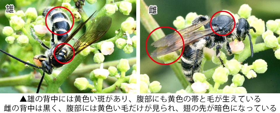 | ヒメハラナガツチバチは、本州から南に分布していて、さまざまな環境で見られる。 他のツチバチと同様、巣をつくることはなく、雌はコガネムシ類の幼虫に卵を産み付ける。 ヒメハラナガツチバチの分布域 ヒメハラナガツチバチは、国内では本州から九州、沖縄地方まで分布している。 国外ではインドから中国や朝鮮半島、台湾やフィリピン、インドネシアなどに分布していて、インドシナ半島などにも分布するとされている。 ヒメハラナガツチバチの大きさ・特徴 ヒメハラナガツチバチは、名前のように、腹部は長く、雄は体長11~19mm程度、雌は15~22mm程と、体は雌の方が少し大きい。 頭部や胸は黒く、毛はほとんど生えていないが、雄の触角は長く、雌の倍ほどはあるなど、雌雄でやや異なっている。 特に、雄の胸の背面にはよく目立つ黄色の斑があるのが特徴で、腹部にもはっきりとした5本の黄色い帯が見られ、黄色っぽい毛も生えている。 一方、雌の胸部背面は全体に黒くて斑などは見られず、腹部にも黄色い帯はなく、4本の帯に見える黄色の毛が生えているだけになっている。 また、雌雄ともに翅は透明感のある褐色をしているが、雌では翅先が暗色になっているのも特徴になっている。