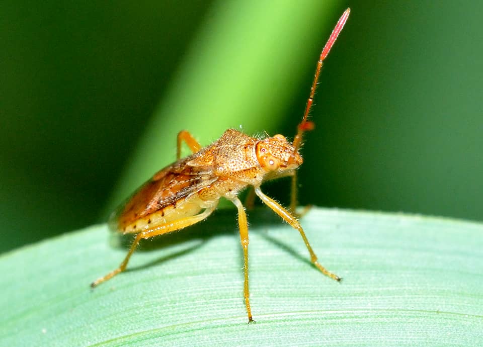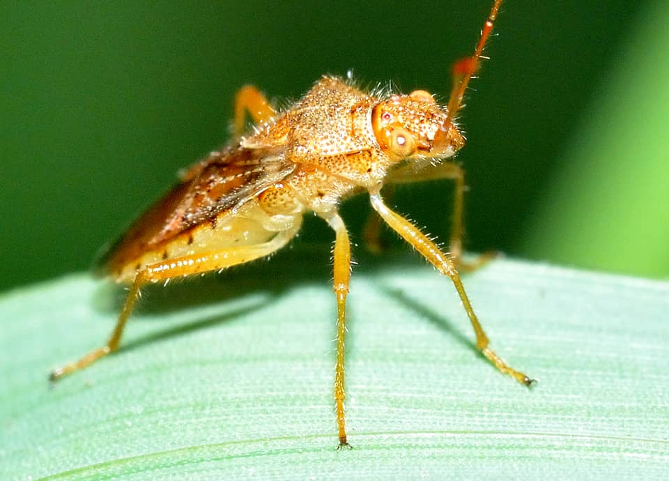 | アカヒメヘリカメムシは各地に広く分布していて、草原や耕作地周辺などで多く見られる。 体は小さいが、体色が茶褐色なので、緑の葉の上などにいるとよく目立つ。 アカヒメヘリカメムシの分布域 アカヒメヘリカメムシは日本や朝鮮半島、中国からベトナム辺りにかけての東アジアに分布していて、国内では北海道から九州、沖縄地方まで広く分布している。 アカヒメヘリカメムシの大きさ・特徴 アカヒメヘリカメムシは体長6~8mm程で、全体に茶褐色や赤みのある褐色の様な色をしている。 頭部から背にかけては小さな暗色の点刻が密に見られるが、脚は体色と同じで、斑や点刻などは見られない。 また、体には細かい毛が多く、触覚にも細かい毛が見られるが、触覚の先(第4節)が赤いのが特徴になっている。 腹部の縁にも褐色の斑があるが、よく見ると翅脈にも幾つかの暗色の斑が見られる。 アカヒメヘリカメムシの生態・生活 アカヒメヘリカメムシは低地から山地まで生息していて、疎林や林縁、草原や耕作地周辺などで広く見られる。 河川沿いの草むらや市街地近郊の公園でも見られ、陽当たりのよい開けた環境に多い。 成虫は主に4~10月頃にかけて見られるが、地域によっては11月頃まで見られる。 成虫、幼虫ともにイネ科やタデ科、キク科など、さまざまな植物から吸汁するが、しばしば各種の花の上でも見られる。 また、アカヒメヘリカメムシは日中に活動するが、夜間の灯火に寄ってくることもある。 卵はイネ科やタデ科などの食草の葉裏などに産み付けられ、冬は成虫で越冬する。 アカヒメヘリカメムシについての参考・その他 アカヒメヘリカメムシは作物のイネにも寄ってきて吸汁し、斑点米の原因となることもあり、時に害虫とされている。 |