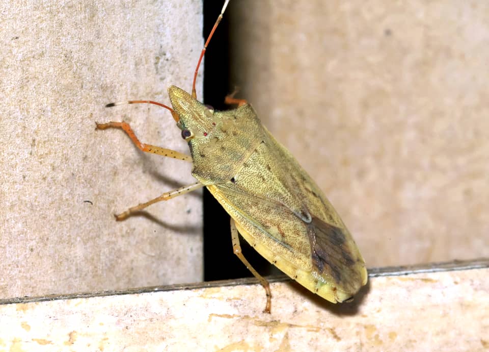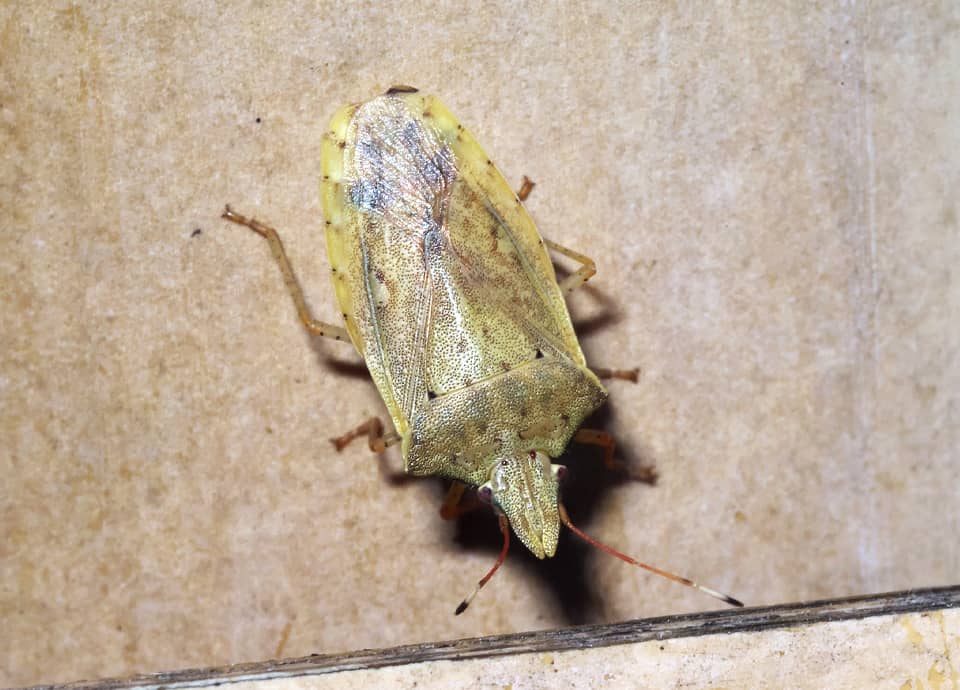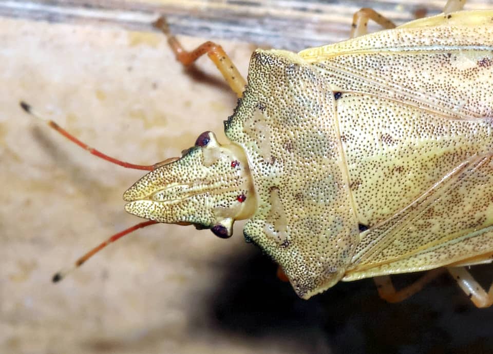 | ヒラタトガリカメムシは体長14~16mm程のカメムシで、全体にクリーム色のような色をしている。 頭部は尖り、先端は側葉が強く突出しているのが特徴になっている。 ヒラタトガリカメムシの分布域 ヒラタトガリカメムシは中国や台湾、日本などに分布していて、国内では南西諸島で見られる。 しかし、近年は韓国でも観察されていて、国内でも四国や九州、本州などに分布域を広げている。 ヒラタトガリカメムシの大きさ・特徴 ヒラタトガリカメムシは体長14~16mm程で、全体に扁平した体つきをしている。 体色は淡い黄褐色やクリーム色の様な色をしていて、触角は体色よりも赤っぽい色をしている。 頭部を含めた背側には暗褐色の小さな斑が密生するように見られるが、比較的大きな幾つか斑も見られ、小盾板の胸側にあるふたつの斑は、単眼と共によく目立つ。 頭部が尖っているのが特徴になっているが、頭部先端は左右(側葉)が強く突出しているのも特徴になっている。 また、胸の左右両側も、やや前方に向かって張り出している。 複眼は暗い茶色のような色をしているが、単眼は赤く、複眼よりも後方の背側についている。 ヒラタトガリカメムシの生態・生活 ヒラタトガリカメムシは低地で見られるが、山地にも生息しているかははっきりしない。 ササなどのタケ類を食草としていることから、竹林などがあれば生息していて、竹林やササなどがあれば市街地近郊の公園でも見られる。 成虫は4月頃から現れるが、詳しい生態などは不明で、越冬の様子なども分からない。 一方、中国や台湾ではタケの害虫とされているようだが、国内ではその様な害はまだ確認されていないようではある。 ヒラタトガリカメムシについての参考・その他 ヒラタトガリカメムシは、以前は八重山諸島に分布していたが、近年は分布域を北へと拡大していて、四国や九州、本州にも分布している。 詳しい分布域は分からず、分布域が連続しているのかも不明だが、愛知県でも観察されているので、この辺りまでは分布しているのだろう。 また、ヒラタトガリカメムシは、環境省のレッドリストに準絶滅危惧種として指定されているが、分布域が広がるにつれ、これが解除されて普通種になるのかもしれない。 |