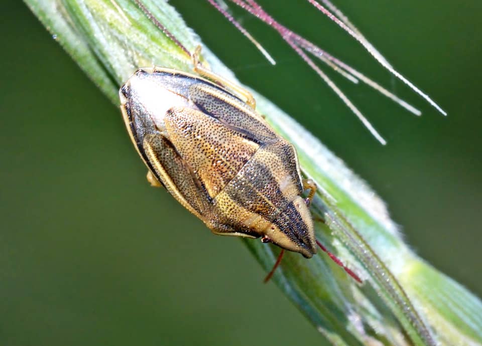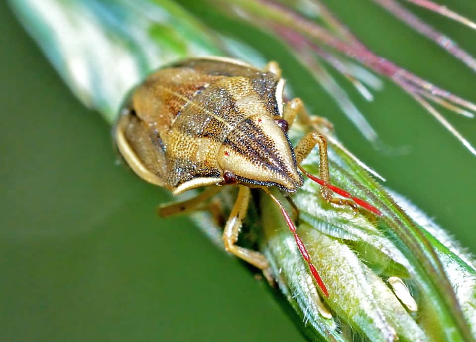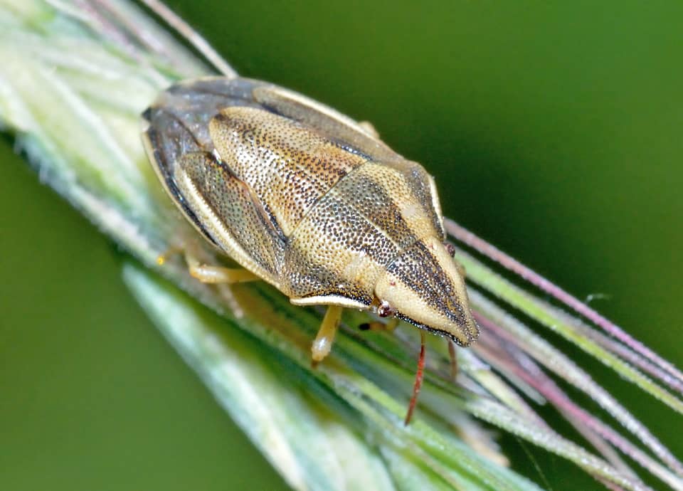 | ウズラカメムシは国内各地に広く分布していて、イネ植物の多いところに生息している。 頭部は三角形で、全体に特徴のある体色と体つきをしている。 ウズラカメムシの分布域 ウズラカメムシは中国や朝鮮半島、ロシア東部などに分布しているカメムシで、国内では北海道から九州まで分布している。 ウズラカメムシの大きさ・特徴 ウズラカメムシは体長8~10mm程で、特徴的な体つきをしている。 上から見るとスプーンの先の様な形にも見るが、頭部は尖り気味で三角形をしている。 体色も特徴的で、褐色の地に淡褐色のはっきりとした縦筋があり、触覚は赤っぽい色をしている。 全体に小さな暗褐色の点刻が見られるが、体色の様子はキジ科のウズラの頭部の様子に似ていて、名前のそのような事から付けられている。 いずれにしてもウズラカメムシは特徴的な体つきと体色をしていて、他のカメムシはとはすぐに違っているのが分かる。 ウズラカメムシの生態・生活 ウズラカメムシは低地から山地まで分布していて、草原や湿地、耕作地周辺などに生息している。 また、イネ科植物が繁茂していれば河川沿いや造成地、公園などでも見られる。 成虫は年に1~2回ほど現れ、主に4~10月頃にかけて見られる。 日中に活動し、成虫、幼虫ともに主にカニツリグサやエノコログサ、チガヤやオヒシバ、メヒシバなど、イネ科植物などを吸汁する。 あまり活発に動き回ることはないようだが、近づいたりすると茎や葉の裏に回り込んで身を隠したりする。 卵もイネ科植物に産みつけられ、冬は成虫で越冬し、草の根際などで単独で過ごす。 ウズラカメムシについての参考・その他 ウズラカメムシはイネ科植物を好むことから、時に稲にも集まり、斑点米の原因となることもある。 しかし、害虫とはされているが、大きな害はないとも言われている。 |