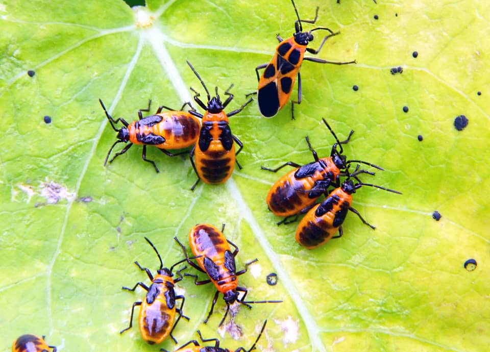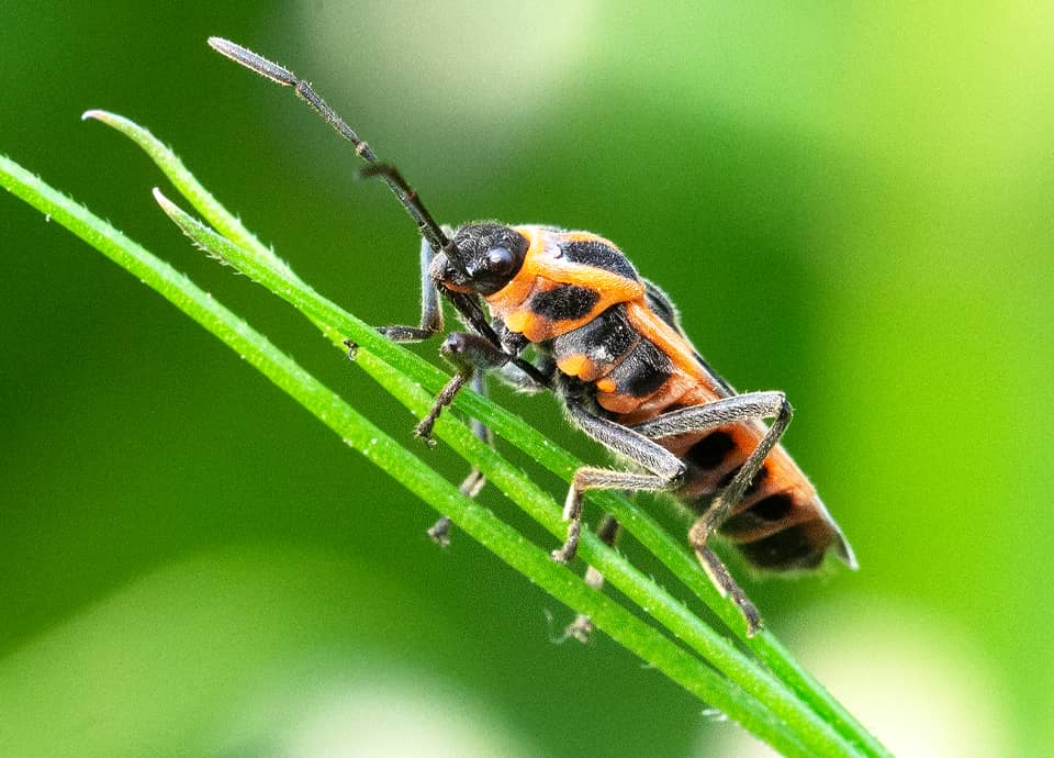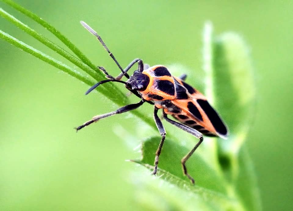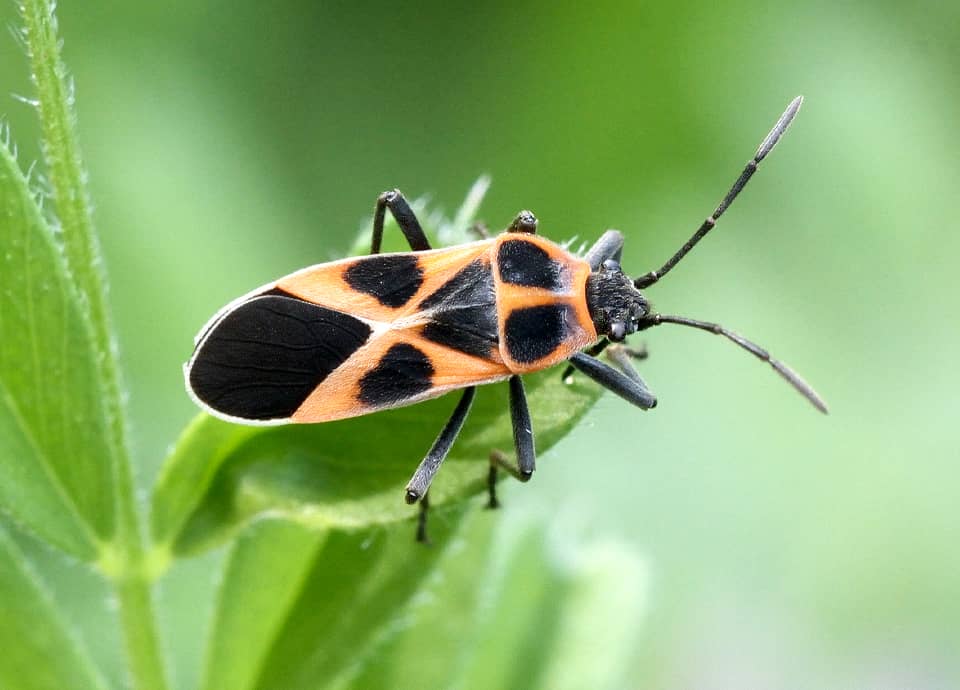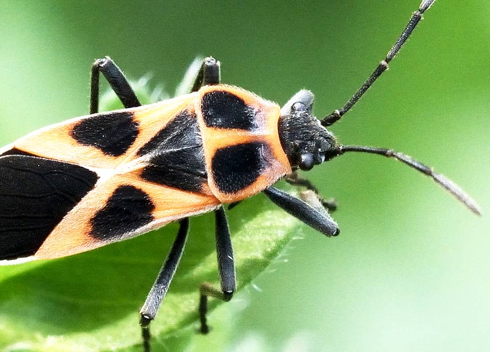 | ヒメジュウジナガカメムシはマダラナガカメムシ科に属していて、はっきりと色分けされた体色が特徴になっている。 本州から南に分布していて、キョウチクトウ科(ガガイモ科)の植物が多いところで見られる。 ヒメジュウジナガカメムシの分布域 ヒメジュウジナガカメムシは中国北東部や朝鮮半島、日本などに分布していて、国内では本州から四国、九州、沖縄地方でも見られる。 ヒメジュウジナガカメムシの大きさ・特徴 ヒメジュウジナガカメムシは体長7~8mm程で、はっきりと色分けされた体色が特徴になっている。 頭部や脚、触覚は黒いが、胸や背側は朱色で、特徴的な大きな黒い斑がよく目立つ。 背側には小さな毛が密生しているのでくすんではいるが、一見して派手な色合いをしていて、外敵への警戒色になっていると考えられている。 同属のジュウジナガカメムシとは似ているが、ジュウジナガカメムシの前胸背側の黒い斑は大きく、ヒメジュウジナガカメムシよりも長くなっている。 ただ、背側の斑には個体差もあって分かりづらいので、詳しくは腹部腹側の斑が、ジュウジナガカメムシは朱色の地色に黒い斑が左右に並んでいるが、ヒメジュウジナガカメムシでは左右の斑が繋がり帯状になっている。 ヒメジュウジナガカメムシの生態・生活 ヒメジュウジナガカメムシは低地から低山地にかけてよく見られ、林縁や草原、河川沿いの草むらなどに生息しているが、耕作地周辺や時には市街地近郊の公園で見ることもできる。 成虫は主に4~10月頃にかけて現れ、地域によっては3~11月頃にかけても見られる。 成虫・幼虫ともに主にキョウチクトウ科(ガガイモ科)の植物の汁などを吸うが、キク科のセイタカアワダチソウなどにも寄ってくる。 また、ブドウ科のヤブガシラなどでも見られ、果実のほか花の蜜も吸う。 しばしば群れで見られ、ひとつの草木に多数が集まっていることも多い。 緑の植物に対してヒメジュウジナガカメムシの体色はよく目立つが、体内にはキョウチクトウ科の植物から摂ったアルカロイドを蓄えていて、カマキリや鳥などの外敵から身を守っている。 体色も毒をもっていることを知らせる警戒色になっているが、多数で群れているのも、外敵への警告の効果を高めているのだろう。 卵はガガイモなどに産み付けられると思うが、冬は成虫で過ごし、草木の根際や岩の下などで集団になって越冬する。 ヒメジュウジナガカメムシについての参考・その他 キョウチクトウ科のトウワタなどは観賞用に利用されることがあるが、ヒメジュウジナガカメムシはトウワタにも寄ってくるので、時には被害を与えることもある。 また、ヒメジュウジナガカメムシは栽培ナスからも吸汁することが知られている。 |