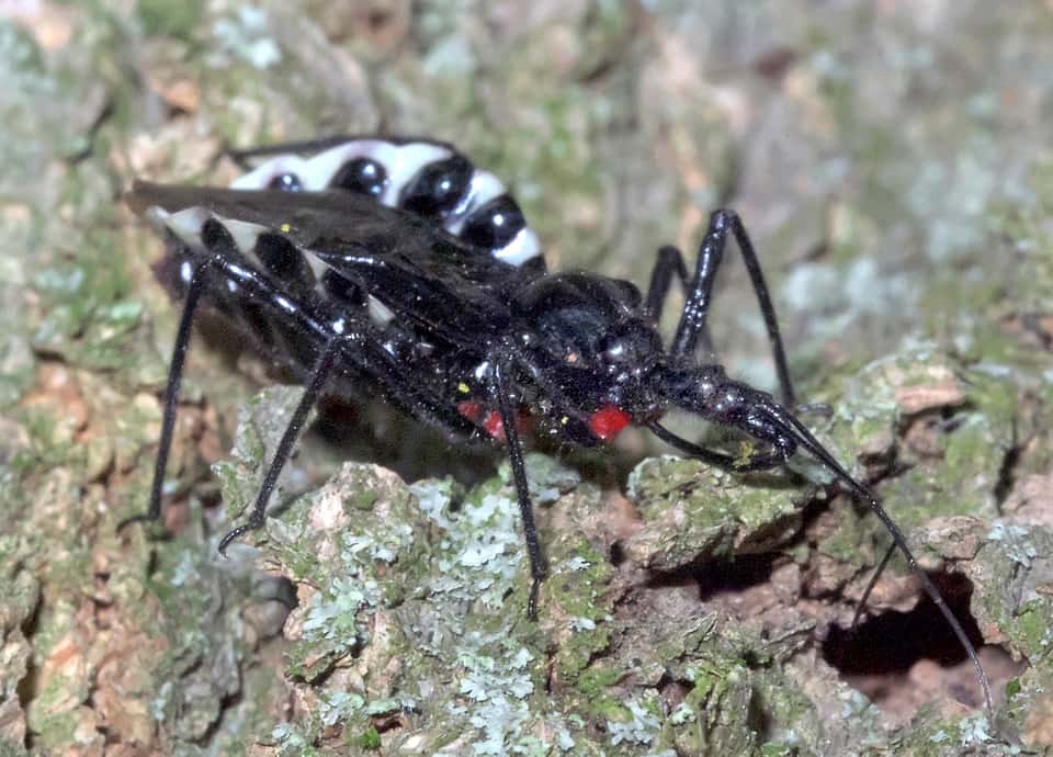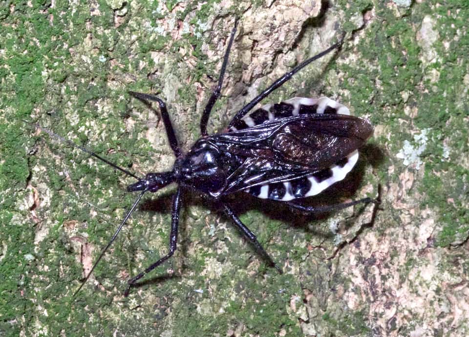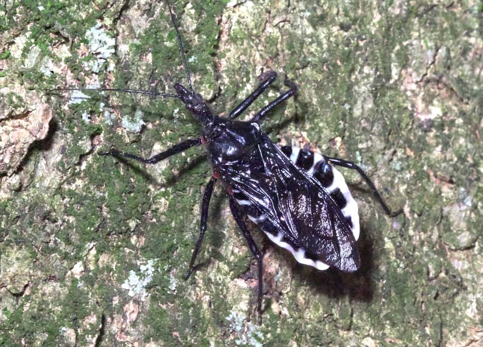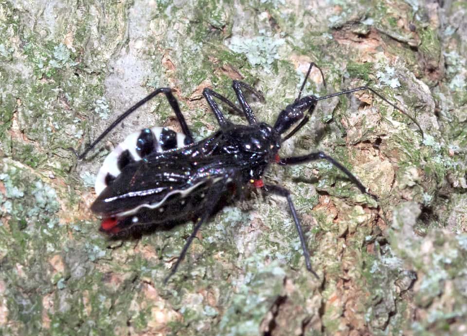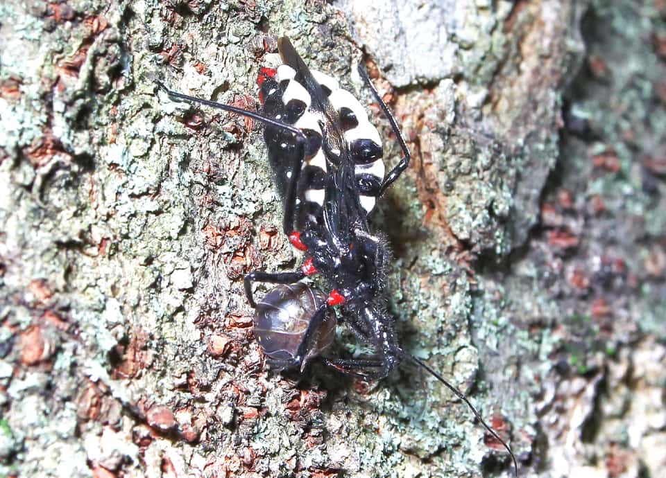 | ヨコヅナサシガメはカメムシの仲間で、国内では関東地方から南に分布している。 全体に光沢のある黒色をしているが、腹部の縁は大きく張り出していて、白と黒のはっきりとした縞模様になっている。 ヨコヅナサシガメの分布域 ヨコヅナサシガメはインドからインドシナ半島、中国などに分布しているカメムシの仲間で、国内では外来種として定着している。 関東地方から南の本州や四国、九州などに分布していて、低地から山地の森林や疎林などに生息している。 ヨコヅナサシガメの大きさ・特徴 ヨコヅナサシガメは体長16~24mmほどもあり、国内で見られるサシガメの中では、もっとも大きいとされている。 体色は光沢のある黒色で、長い毛に覆われ、成虫では、各脚の基部と腹端2節が鮮やかな赤色をしているのが特徴になっている。 また、腹部の縁は波打つように大きく張り出していて、白黒の縞模様になっているのも大きな特徴になっている。 名前の「ヨコヅナ」は、この白黒の模様が、相撲で用いられる「化粧まわし」に似ていることから付けられているが、うまく特徴をとらえている。 頭部は細長く、長い口吻をもっているが、口吻は餌を獲るとき以外は折り曲げられている。 一見するとシマサシガメに似ている感じがするが、ヨコヅナサシガメの脚は黒く、シマサシガメの様な白黒の縞模様に放っていない。 また、ヨコヅナサシガメは幼虫、成虫ともに全体が黒いが、孵化直後や脱皮、羽化直後は鮮やかな朱色や赤色をしている。 ヨコヅナサシガメの生態・生活 ヨコヅナサシガメは低地から丘陵地、低山地などの森林や疎林などに生息しているが、人里近くなど、人の生活圏にも生息している。 樹木があれば、市街地や住宅地の公園でもしばしば見られる。 成虫は主に4~10月頃にかけて現れ、サクラやエノキ、ニレやケヤキなどの古木の幹に多いが、公園などにはサクラやニレなどが多く植えられていることもあり、立ててある樹名版で見られることもある。 ヨコヅナサシガメは成虫・幼虫共にさまざまな樹木の上で生活していて、幹や枝を歩き回って昆虫やその幼虫、クモ類などを捕らえ、長い口吻を突き刺して体液を吸い取る。 また、幼虫は大きな獲物を集団でとらえているのが、しばしば観察される。 低木では見られず、普段は木の高い場所で生活しているが、産卵期になると幹の下の方に下りてくる。 成虫は6~7月頃に樹洞など産卵し、卵は20~30日ほどで孵化する。 他のカメムシ類と同様、ヨコヅナサシガメは不完全変態種で、幼虫は成虫と同じ形態をしている。 幼虫は脱皮を繰り返し、12月までには羽化前の5齢幼虫に成長する。 冬は幼虫で過ごし、幹の窪みや剝がれかけた樹皮の間などで、数十かそれ以上が集まって越冬する。 翌年の春になると、終齢幼虫から脱皮して成虫として現れる。 ヨコヅナサシガメについての参考・その他 ヨコヅナサシガメは、キマダラカメムシなどと同じ外来のカメムシで、九州地方では1930年代には既に観察されている。 侵入経路などは分かっていないが、その後、徐々に分布域を広げ、1990年代には関東地方でも観察されるようになっている。 現在は特定外来生物などの指定はされていないが、在来の昆虫類への影響が心配されている。 また、不用意に触れたりすると刺されることがあり、痛みやかゆみが1週間ほど続くこともあるので注意する必要がある。 |