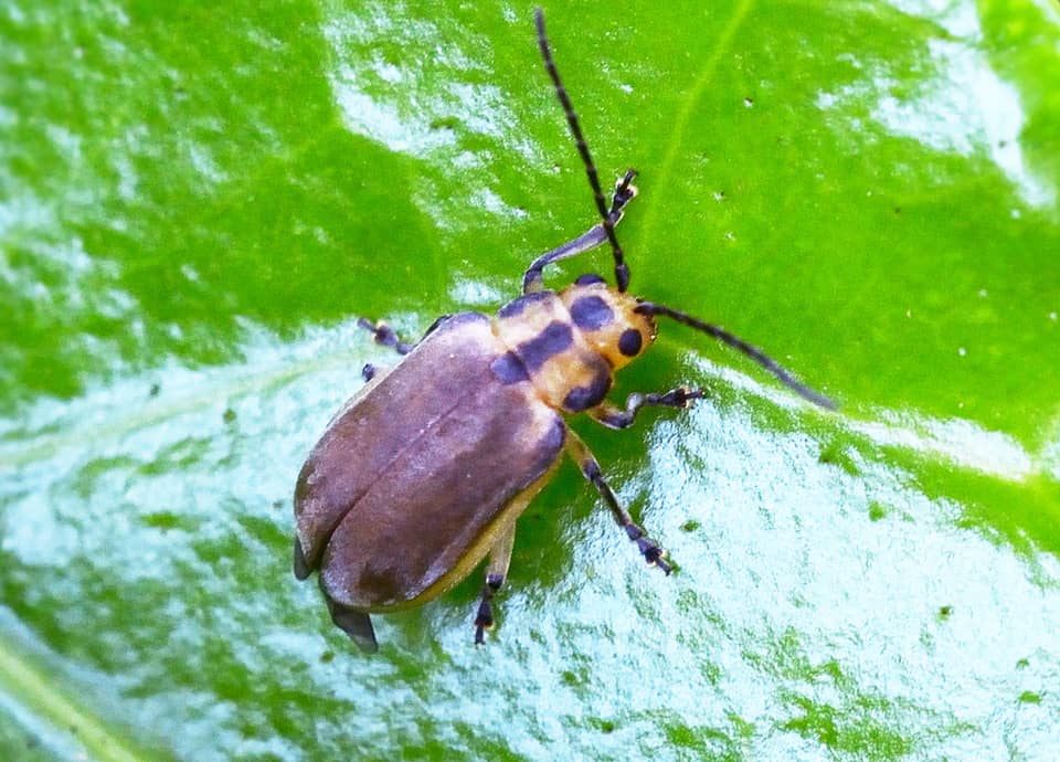 | サンゴジュハムシは、名前のように、スイカズラ科のサンゴジュによく見られるハムシで、全体に黄褐色をしている。 国内各地に分布していて、街路樹や庭先、公園などでも見られる。 サンゴジュハムシの分布域 サンゴジュハムシは北海道から九州、沖縄地方まで広く分布していて、国外では中国や台湾などにも分布している。 サンゴジュハムシの大きさ・特徴 サンゴジュハムシは全長6~7mm程で、全体に黄褐色から淡褐色のような色をしている。 上翅はやや暗色で、頭頂から胸を通り、小楯板にかけて黒い斑があるのが特徴になっている。 また、胸の両脇にも黒い斑が見られ、目や触角も黒い色をしていて、上翅の縁も黒っぽい色をしたものが多い。 一見するとニレハムシとよく似ているが、サンゴジュハムシは全体に黄褐色のような色をしているが、ニレハムシは全体に赤みが強くなっている。 また、斑の様子も違っていて、ニレハムシには触角の間にも黒い斑があるが、サンゴジュハムシにはこの黒い斑が見られない。 触角を見ると、サンゴジュハムシの触角の第3節は第2節の2倍近い長さ(1.5倍とする資料もあるが、実際は.15~1.8倍ほどの長さはある)があるが、ニレハムシの触角の第2節と第3節の長さはそれ程は変わらない。 ブチヒゲケブカハムシともよく似ているが、ブチヒゲケブカハムシの触角の第3節は第2節の2倍以上の長さがあるほか、サンゴジュハムシの前胸背側の黒斑は胸の前縁近くに達しているが、ブチヒゲケブカハムシの黒斑は後ろ縁付近だけにあるなどの違いがある。