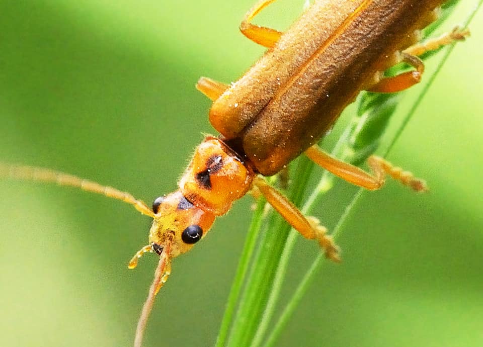 | セボシジョウカイは触角が長く、一見するとカミキリムシの仲間に似ているが、ジョウカイボン科に属している。 主に本州から九州にかけて生息していて、公園などでも見られる。 セボシジョウカイの分布域 セボシジョウカイは本州から四国、九州などに分布していて、隠岐や壱岐、佐渡島や対馬、屋久島などの島嶼部にも分布している。 また、北海道の一部・渡島半島などにも分布していると言われている。 セボシジョウカイの大きさ・特徴 セボシジョウカイは全長9~11mm程で、ジョウカイボンの中では小型の部類に入る。 体色は黄色から黄橙色をしているが、頭部と前胸の背に黒い斑があるのが特徴で、「セボシ」の名前の由来にもなっている。 ただ、この斑には変化があり、中には黒い斑が見られないものもいる。 また、触覚や脚も黄橙色をしているが、上翅はやや暗く、腹部の腹側は黒っぽい色をしている。 触角が長く、一見するとカミキリムシの仲間のようにも見えるが、セボシジョウカイはジョウカイボン科に属している。 ジョウカイボンの仲間はカミキリムシなどの甲虫に比べると上翅が硬くなく、上翅を含めて体全体が柔らかいこともセボシジョウカイの特徴になっている。 セボシジョウカイの生態・生活 セボシジョウカイは低地から低山地にかけて多く見られ、樹林や林縁、耕作地周辺など、広く生息している。 草むらや社寺林、公園などでも見られ、低木の葉の上にとまっていることも多い。 成虫は主に5~8月頃にかけて見られるが、地域によっては4月頃からでも見られる。 成虫はハエやガ、トビケラやカワゲラ、アブラムシなどの小さな昆虫を食べるが、しばしば花にも集まり蜜や花粉を食べることもある。 また、日中に活動するが、セボシジョウカイは夜間の灯火に寄ってくることもある。 卵は土の中にまとめて産み付けられ、孵化した幼虫も動物質のものを食べ、林床などの地表を動き回って小さな昆虫類やダンゴムシなどの小動物を食べる。 冬は幼虫で越冬し、翌年の春にはサナギになる。 セボシジョウカイについての参考・その他 セボシジョウカイは本州から九州まで分布しているが、関東地方南部や伊豆半島周辺、伊豆諸島などには別種のオカベセボシジョウカイ(Lycocerus okabei)も分布している。 西日本などではセボシジョウカイだけが見られるが、両種は大変よく似ていて、外見だけの判別は困難と言われている。 |