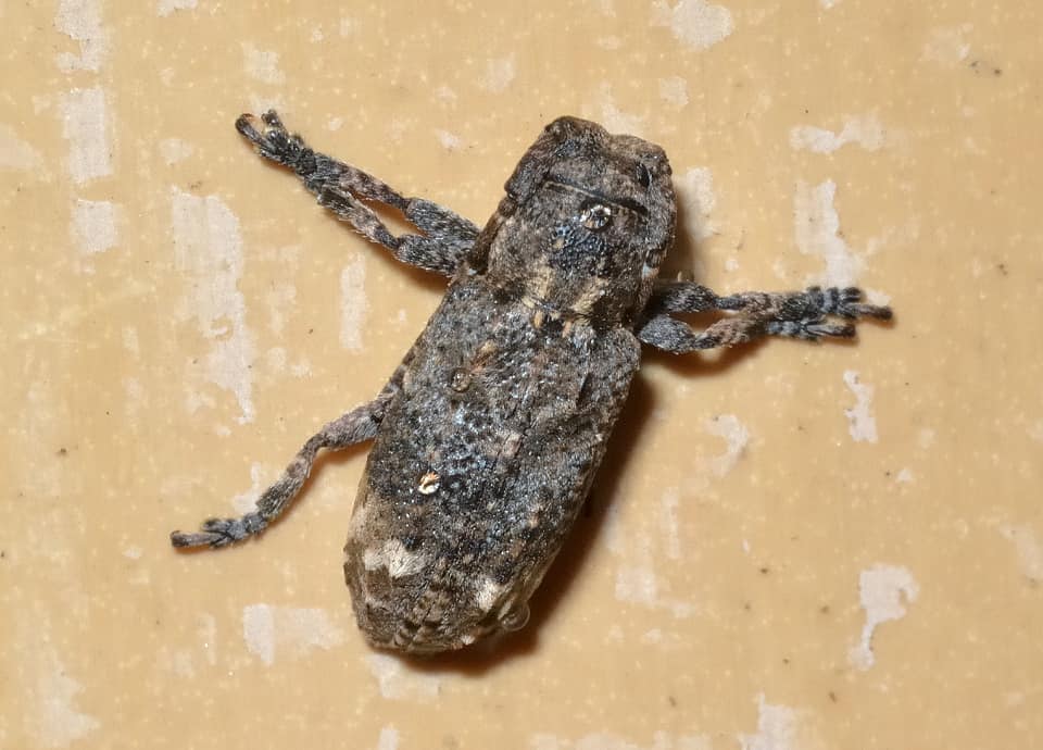 | アトモンサビカミキリは国内各地に分布していて、広葉樹林やその周辺などで普通に見られる。 前胸の背には2本の黄白色の縦筋があり、上翅の後方には三角形に見える黄白色の斑が一対あるのが特徴になっている。 アトモンサビカミキリの分布域 アトモンサビカミキリは、中国から朝鮮半島、日本などに分布していて、国内では北海道から本州、四国、九州まで分布している。 伊豆諸島や佐渡島、隠岐や対馬、種子島などの島嶼部にも生息していて、各地でふつうに見られる。 アトモンサビカミキリの大きさ・特徴 アトモンサビカミキリは体長7~10mm程のカミキリムシで、体は雌の方が雄よりもやや大きい。 また、触覚は雄の方が長いが、腹部の後端までは届かない。 体は褐色から黒褐色で、全体はまだら模様のようにも見え、茶褐色の微毛に覆われている。 脚や触覚にも斑があり、上翅の後方には三角形に見える黄白色の斑が一対見られ、これがアトモンサビカミキリの特徴になっている。 アトジロサビカミキリとはよく似ているが、アトモンサビカミキリの前胸の背には2本の白い縦筋が見られるのも特徴になっている。 また、アトモンサビカミキリには、肩の後方から上翅の中央会合部にかけて、V字に見えるような凹みがある。 アトモンサビカミキリの生態・生活 アトモンサビカミキリは低地から山地にかけて生息していて、広葉樹林やその周辺などに普通に見られる。 寺社林や樹木の多い公園にも生息していて、時には貯木場でも見られる。 成虫は年に1回現れ、主に5~9月頃にかけて見られるが、地域などによっては4~10月頃まで見られる。 クワやネムノキ、イチジクなど、様々な広葉樹の枯れ木などを食べ、薪なども食べる。 幼虫も各種の枯れた広葉樹を内側から食べるが、マツ科のモミなどで見られることもある。 冬は成虫で越冬するが、幼虫のまま枯れ木の中で冬を越すとも言われている。 アトモンサビカミキリについての参考・その他 アトモンサビカミキリは広葉樹林に広く生息しているが、針葉樹林で見られることもある。 また、日中に活動するがあまり活発に動き回ることはなく、時には夜間の灯火に寄ってくることもある。 |