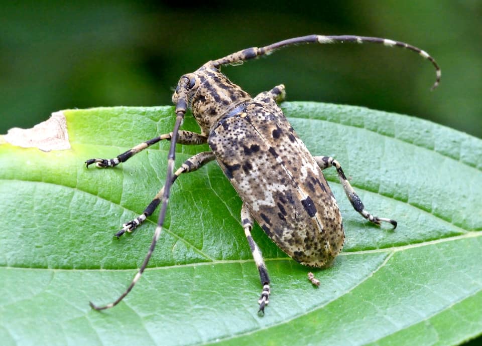 | ナガゴマフカミキリは各地に広く分布していて、主に5~8月頃にかけて見られる。 様々な広葉樹の枯れ木や倒木などで見られるが、体色は保護色になっていて見つけづらい。 ナガゴマフカミキリの分布域 ナガゴマフカミキリは、ロシア東部や中国、朝鮮半島や日本などに分布していて、台湾にも分布している。 国内では北海道から九州まで分布していて、佐渡島や伊豆諸島、隠岐や壱岐、種子島や屋久島などの島嶼部のほか、奄美大島にも分布している。 ナガゴマフカミキリの大きさ・特徴 ナガゴマフカミキリは体長13~22mm程で、体はふつう雌の方が大きいが、雄の触覚は雌に比べるとかなり長くなっている。 全体は褐色と淡褐色のまだら模様のようで、暗褐色の細かい斑が散在している。 脚や触覚も淡褐色と暗褐色のまだら模様で、前胸の背には2本の暗褐色の縦筋があるのが特徴になっていて、この筋は後頭部まで延びている。 また、ふつう上翅の中央よりやや後方には、淡色の波型模様が見られる。 しかし、体色や斑の様子などには変化があるので、全体の様子を見る方がよい。 ナガゴマフカミキリの生態・生活 ナガゴマフカミキリは、低地から低山地の森林や疎林、二次林などに生息していて、個体数は多いと言われている。 伐採林や寺社林などにも生息していて、樹木などが多ければ市街地近郊の公園でも見ることができる。 成虫は年に1回現れ、主に5~8月頃にかけて見られるが、地域によっては4~9月頃まで見られる。 クヌギやケヤキ、サクラやイチジクなど、様々な広葉樹の枯れ木や倒木、伐採木などに集まり、それらの樹皮などを食べるが、フジの枯れ蔓や薪などでも見られる。 樹木にいると保護色になっているので見つけづらいが、しばしば葉の上でも見られ、赤いタカラダニに寄生されているものも見られる。 また、ナガゴマフカミキリは昼間に活動するが夜間も活動し、灯火に寄ってくることもある。 卵は広葉樹の樹皮下などに産み付けられ、冬は幼虫で過ごし、朽ち木などを食べながら越冬する。 ナガゴマフカミキリについての参考・その他 ナガゴマフカミキリは国内で広く見られるが、天敵は大型のムシヒキアブ類やカマキリ類、大型のクモ類などと言われている。 |