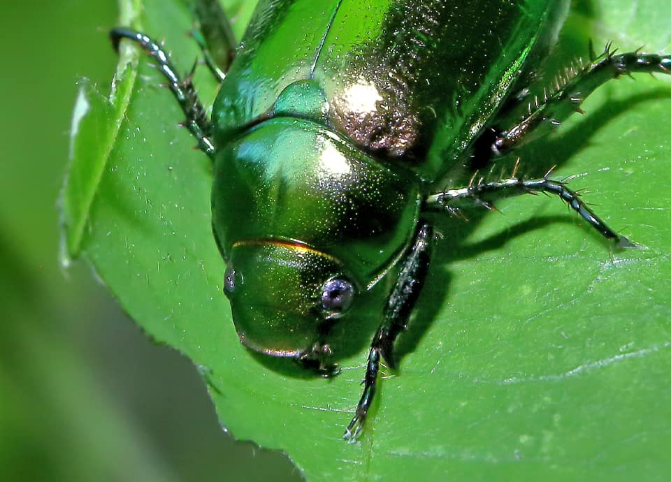 | コガネムシは馴染みのある甲虫で、市街地近郊の公園などでも観察することができる。 全体に強い輝きがあるのが特徴になっていて、鮮やかな緑色をしているものが多い。 コガネムシの分布域 コガネムシは本州から四国、九州地方にかけて分布していて、北海道にも分布するとされている。 また、国外ではインドからインドシナ半島を経て、中国東部や朝鮮半島にかけて広く分布していて、台湾などのほか、ロシア極東地方にも分布している。 コガネムシの大きさ・特徴 コガネムシの全長は17~24mm程で、漢字表記では「黄金虫」と書かれるように、全体に金属光沢がある。 上翅には細かな点刻の列が見られ、体色は緑色が多いが、中には赤紫や暗い紫色をしたようなものも見られ、変化がある。 しかし、いずれも強い金属光沢があるのが特徴で、コガネムシ類の中では、もっとも光沢が強いと言われていて、美しい輝きをしている。 また、体は雄よりも雌の方がやや大きくなる傾向がある。 コガネムシの仲間はよく似ているものが多く、一見するとカナブンに似ているが、コガネムシは全体に丸みのある体つきをしているが、カナブンはコガネムシよりも角ばった体つきをしている。