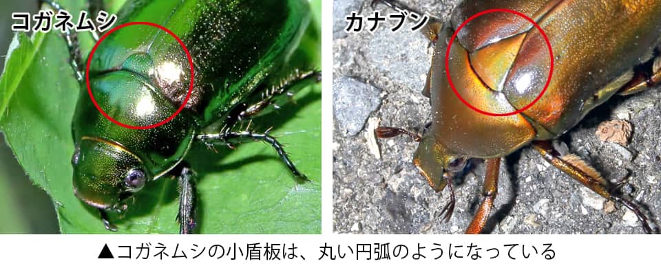 また、上翅の間、胸の後方にある小盾板と呼ばれているところを見ると、コガネムシでは円弧のような丸い形をしているが、カナブンでは二等辺三角形のように長くなっているなどの特徴がある。 しかし、ヒメコガネとは大変よく似ている。 ヒメコガネは体長13~17mm程で、体の大きさはコガネムシの方がずいぶん大きいが、単独で見たり写真だけだと分かりづらいことも多い。 一般に、コガネムシでは、胸の部分に浅い縦筋か見られるほか、胸の部分(前胸背板と呼ばれる部分)を見ると、コガネムシでは、この部分が全体の5分の1程だが、ヒメコガネでは4分の1程の大きさがあると言われている。