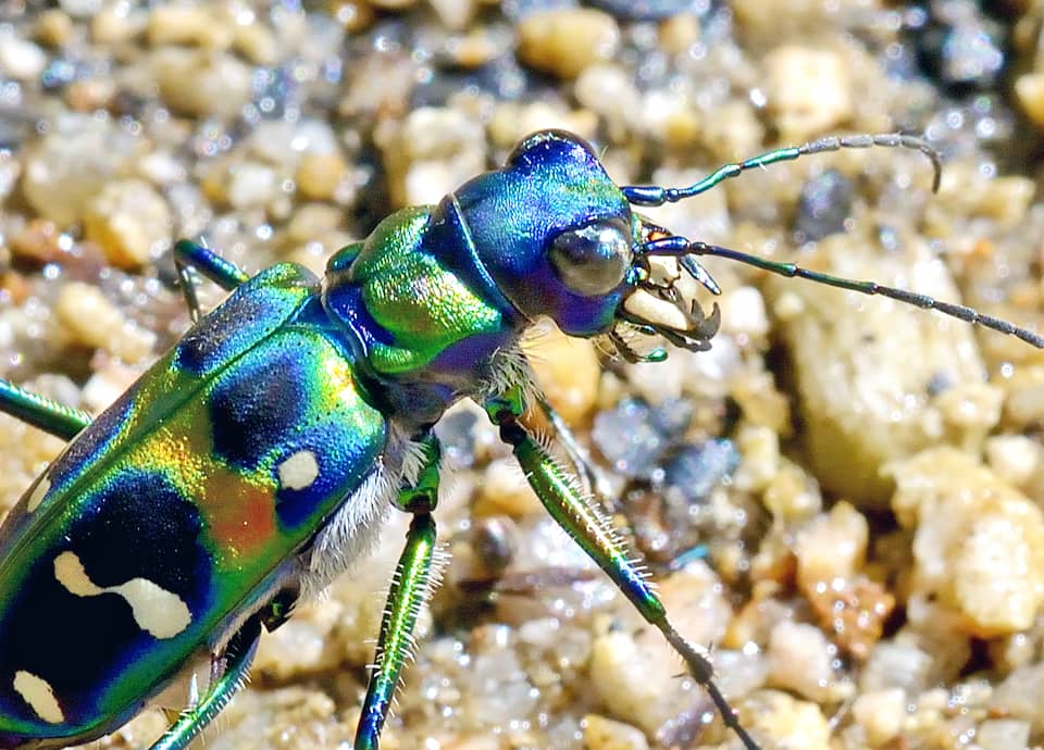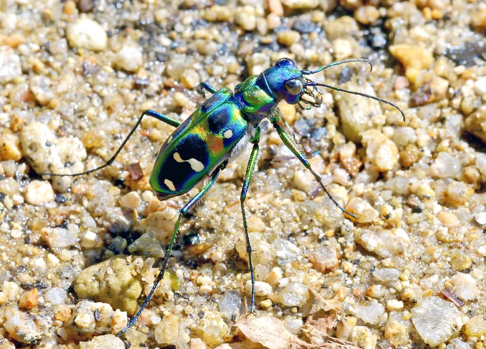 | ハンミョウはオサムシ科に属している綺麗な昆虫で、「ナミハンミョウ」と呼ばれることもある。 身近な昆虫だが、近年は生息数が減少傾向にあると言われている。 ハンミョウの分布域 ハンミョウは日本の固有種とされていて、本州から四国、九州にかけて分布していて、屋久島や種子島にも分布している。 また、沖縄地方のものは亜種とされていたが、現在は別種・ C. okinawana (オキナワハンミョウ)とされているほか、奄美地方にはCicindela ferriei (アマミハンミョウ)が分布している。 ハンミョウの大きさ・特徴 ハンミョウは体長18~20mm程で、国内に分布しているハンミョウ類では最も体が大きい。 全体に赤褐色や緑、濃青色などのマダラ模様で、触覚や脚も同じような色をしているのが特徴になっている。 上翅には幾つかの白斑があるのも特徴で、全体に光沢のある美しい体色をしている。 また、複眼は大きく、大顎も大きくてよく目立つほか、いずれの脚も長く、とまっている時は上体を起こすようにしているのがよく観察される。 ハンミョウの生態・生活 ハンミョウは、主に低地から低山地にかけて生息していて、林道や農道など、開けた環境で見られることが多い。 湖沼や河川沿いなど、水辺近くで観察されることも多いが、寺社の境内や市街地近郊の公園でも見られる。 成虫は主に4~10月頃に現れ、成虫・幼虫ともに、他の昆虫類をとらえるが、成虫は昆虫の死骸や動物の死肉なども食べる。 また、幼虫は土中に縦穴を掘り、頭と胸で蓋をするようにして生活しているが、幼虫は近くを通る昆虫類をとらえ、穴に引き込んで食べる。 雌は土の中に産卵し、冬は成虫で越冬するが、幼虫で冬を過ごすものも見られる。 ところで、ハンミョウは「ミチオシエ(道教え)」などとも呼ばれている。 これは、近づくと少しの距離を開けて素早く走るか飛んで逃げるが、追いかけると、また同じように少しの距離をあけて逃げる。 しばしばその様な行動を繰り返すが、それが行く道を示している様にも思えることから付けられている。 ハンミョウについての参考・その他 ハンミョウは市街地近郊の公園でも見られるが、近年は生息数が減少傾向にある。 主な原因は生息地の減少や生息環境の劣化などと考えられているが、地域によっては生息地が著しく減少していて、自治体によっては準絶滅危惧種などに指定している。 |