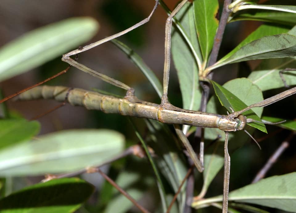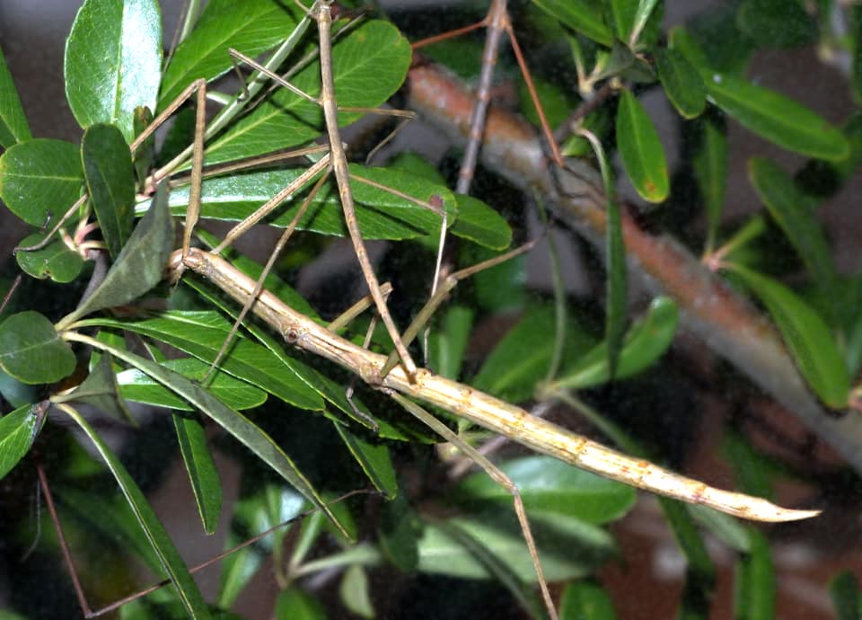 | ヤエヤマトガリナナフシは沖縄地方に分布している大型のナナフシで、大きいものは体長15cm近くになるものも見られる。 夜行性の昆虫で、トウダイグサ科などの葉を食べる。 ヤエヤマトガリナナフシの分布域 ヤエヤマトガリナナフシは日本のほか、台湾にも分布していると言われている。 しかし、国内の分布域は限られていて、名前のように石垣島や竹富島、西表島などの八重山列島に分布している。 ヤエヤマトガリナナフシの大きさ・特徴 ヤエヤマトガリナナフシは体長8~14cm程もあり、国内ではもっとも大きいナナフシと言われている。 体は雌の方が大きく、12~14cm程もあるが、雄でも8~10cm程の大きさがある。 雌雄ともに体は非常に細長く、体色は緑色から褐色、暗褐色まで変化があるが、他のナナフシ類のように木の枝などによく擬態している。 雌の腹部の後端は尖っていて、名前の「トガリ」の由来になっている。 しかし、近似種は大変よく似ていて、詳しくは交尾期など解剖して判断する必要があるとされている。 ヤエヤマトガリナナフシの生態・生活 ヤエヤマトガリナナフシは林縁や茂み、藪などに生息していて、成虫は1年を通して見られる。 詳しい生態などは分からないが、夜行性の昆虫で、アカメガシワやヤンバルアカメガシワ、オオバなどのトウダイグサ科植物の葉を食べる。 ひとつに複数が一緒に見られることもあるので、ある程度の群居性があるようにも思える。 卵は地面にそのまま産み落とされるが、卵は縦長の茶色っぽい種子のようで、地面にあっても分かりづらいものになっている。 ヤエヤマトガリナナフシについての参考・その他 ヤエヤマトガリナナフシの脚は細くて非常に取れやすくなっているが、とらえたりすると自ら切り落としてしまうことが知られている。 これはトカゲが尻尾を自切するのと同じで、外敵などから身を守っているのだろう。 また、幼虫の場合、切れた脚は脱皮するごとに再生していき、触覚も同様に再生する。 尚、以前はアマミナナフシと呼ばれていが、現在は幾つかの種に別けられ、ヤエヤマトガリナナフシも独立種とされている。 |