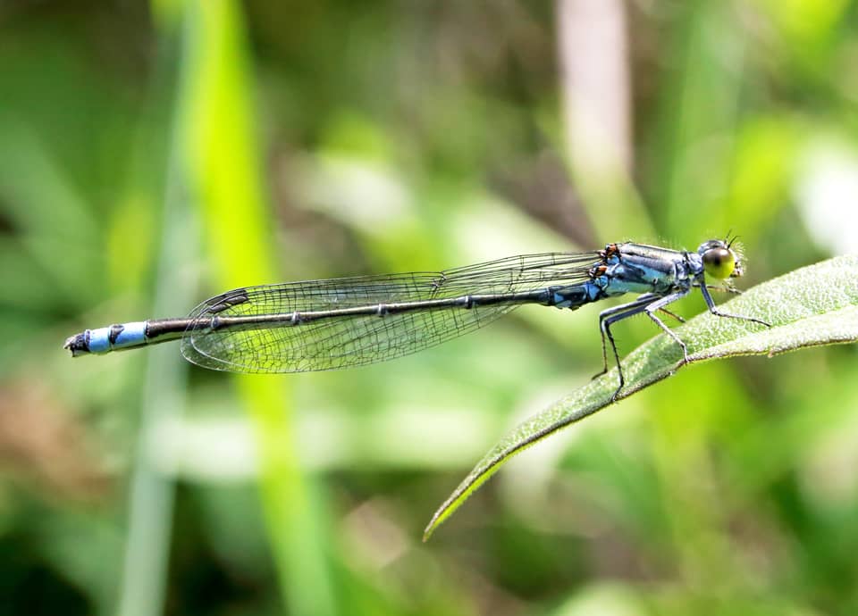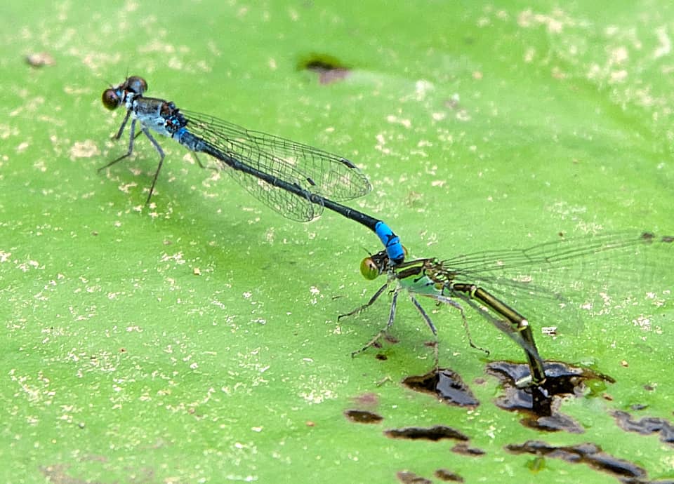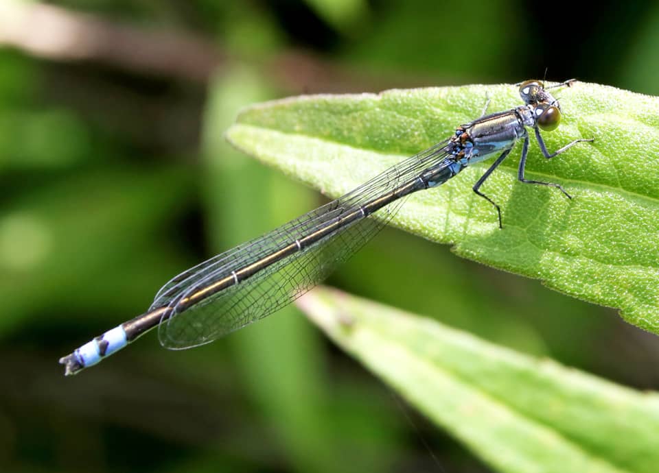 | クロイトトンボは市街地近郊でも見られるイトトンボで、春から秋まで長期間に渡って見られ、観察期間も長い。 雄の腹部の先は水色で、成熟すると胸の横が粉を吹いたように白くなる。 クロイトトンボの分布域 クロイトトンボは、日本や朝鮮半島、中国北東部などに広く分布しているイトトンボの仲間で、国内でも北海道から九州まで広く分布している。 佐渡や隠岐諸島、対馬や大隅諸島などの島嶼部にも生息していて、低地から低山地にかけての水生植物が繁茂する池沼などでふつうに見られる。 クロイトトンボの大きさ・特徴 クロイトトンボは全長27~35mm程のイトトンボで、雌雄でやや体色が違っている。 雄では、胸の背側は黒く、未成熟のものは胸部側面が黄緑色のような色で、腹部の先(第8~9節)が鮮やかな青色をしている。 成熟した雄は胸部側面が水色をしているが、頭から胸部にかけて粉をふいたように白っぽくなる。 一方、雌は腹部が緑色のものと雄と同じような青いものがいて、雄の青色部分の下側がふつうは淡色になっている。 クロイトトンボの仲間はどれもよくにているが、本種の特徴は、雄では翅前方の胸の背側が黒く、淡い斑などが見られないのが特徴になっていて、尾部上付属器は「八」の字のように開いている。 また、雌雄ともに、眼後紋(イトトンボ類の頭部背面後方にある斑)があるが、眼後紋を結ぶ後頭条と呼ばれる筋がないことなども特徴になっている。 ただ、イトトンボの仲間は体が小さいので、自然下では肉眼で見ただけでは分かりづらい。