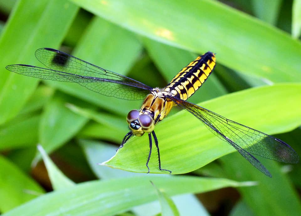 | ハラビロトンボは、トンボの中では小型の類で、名前のように、雌雄ともに腹部が幅広いのが特徴になっている。 池や沼などの止水域に多く、成虫は夏の頃に多く見られる。 ハラビロトンボの分布域 ハラビロトンボは、ロシア極東地方や中国、朝鮮半島や日本などに分布していて、国内では北海道南西部から本州、四国、九州地方に分布している。 ハラビロトンボの大きさ・特徴 ハラビロトンボは体長33~42mm程で、ナツアカネと同じほどの大きさがある。 しかし、名前の様に、腹部が扁平していて幅が広いのが特徴になっている。 腹長は20~25mm程で、腹部は雌の方が幅広いが、雌雄ともに脚や翅脈は黒っぽく、翅の基部には僅かに橙色の部分がある。 ハラビロトンボの体色は雌雄で異なっていて、雌や未成熟の雄は全体に黄色っぽく、腹部は黄色と黒の縞模様のようになっていて、胸の背側にも黒っぽい縦筋が見られる。 ハラビロトンボは、成熟しても雌はあまり体色は変わらず、黄色い部分が濃くなる程度だが、雄は成熟するにつれ黒化し、腹部にはシオカラトンボの様に青白い粉が見られるようになる。 また、雌雄ともに未成熟な時の複眼は黄緑色をしているが、成熟すると雌の複眼の上部は褐色になる。 一方、ハラビロトンボの雄は成熟すると複眼も黒くなるほか、雄雌ともに、顔の額上部が青い金属光沢を放つようになるが、雄の方が鮮やかな色に見える。 ハラビロトンボの生態・生活 ハラビロトンボは低地から丘陵地にかけて生息していて、池や沼、湿地や湿気のある休耕田などで見られる。 池や沼などでは水深が浅く、水生植物の多いところを好み、水源から遠く離れるようなことはない。 また、ハラビロトンボは主に止水域に生息しているが、流水域でも流れの緩やかな小川などなら見ることができる。 地域によって異なるが、成虫は4~10月頃かけて現れ、夏の間に多く見られる。 他のトンボ類と同じように、池や沼などで羽化した成虫は、周辺の草むらや林縁などに移動し、昆虫類などを食べて成長する。 成熟すると羽化した水場へ戻り、雄は縄張りを張って雌を待ち受けるようになる。 交尾後、雌は単独で産卵するが、産卵は打水産卵で、抽水植物に隠れるように、腹の先を水面に打ち付けるようにして行われる。 その間、雄は雌の上空にホバリングするように留まっていて、辺りを警戒して、雌を守るようにしている。 幼虫(ヤゴ)は水生で、ミジンコやボウフラ、 水生昆虫などを食べて成長し、冬は幼虫で越冬し、翌年の春を待って成虫となる。 ハラビロトンボについての参考・その他 ハラビロトンボは、以前は池や沼周りなどでふつうに見られたが、近年の開発による水田の減少や水路の護岸、湿地の埋め立てなどによって生息地が減少していて、それに伴い個体数も減少している。 自治体によっては準絶滅危惧種や絶滅危惧種に指定しているが、更なる生息地の減少が心配されている。 尚、国内のハラビロトンボの仲間には、九州から沖縄地方にかけて別種のLyriothemis elegantissima (オオハラビロトンボ)、西表島にも別種のLyriothemis flava (キイロハラビロトンボ)が分布している。 |