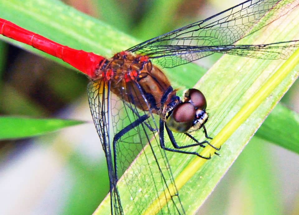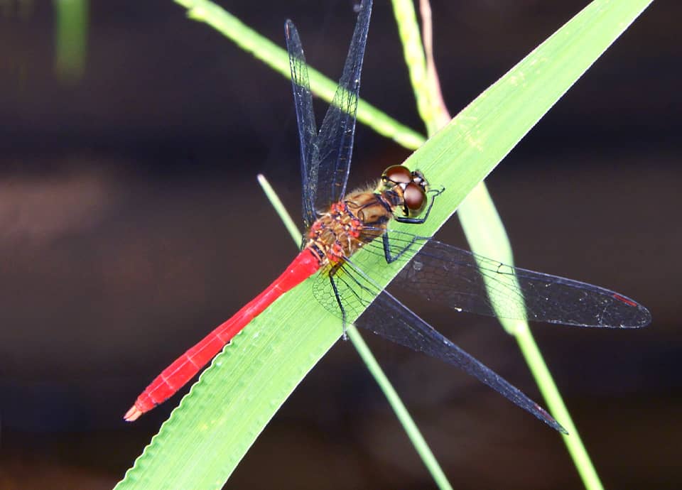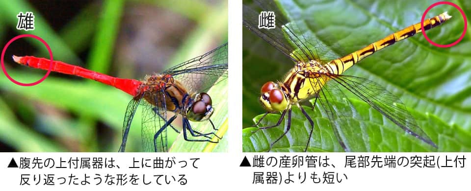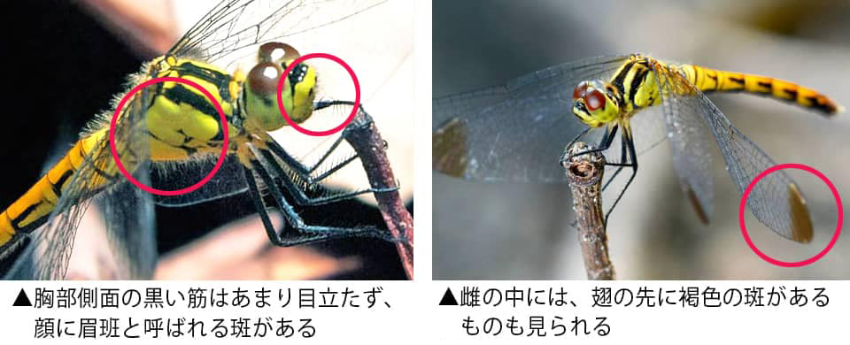 マユタテアカネの生態・生活 マユタテアカネは低地から丘陵地などにかけて生息していて、水田や池沼、湿地周りなどで見られる。 河川周辺でもふつうに見られるが、マユタテアカネは水辺近くに疎林などがあるような、やや薄暗い環境を好むと言われている。 成虫は主に6~11月頃にかけて現れるが、地域によっては12月頃まで見られる。 羽化した成虫は、水辺を離れ、周辺の疎林やその周辺などで、ハエやカ、チョウやガなどの昆虫類などを食べて成長する。 成熟すると羽化した水域に戻って繁殖を行うが、成熟した雄は水辺の草木などにとまって縄張りをつくり、しばしば周辺を警戒飛行している。 繁殖は夏の終わりころから見られ、雌が訪れると交尾をはじめるが、マユタテアカネの繁殖は、水辺の植物や地面にとまって行われる。 雄は腹を曲げて雌の頭部をつかみ、ハート形のような形になる。 その後、雌雄が連結したまま産卵水域に向かうが、これは他の雄に邪魔されないためと言われている。 マユタテアカネの産卵は、連結したままか雌が単独で産卵するが、雌は腹部の先で水面などを叩くようにする打水産卵か打泥産卵で、池沼の水面や湿気のある水際の泥などに産卵する。 冬は卵で過ごし、翌年の4月下旬から孵化して幼虫(ヤゴ)が現れる。 幼虫はミジンコや水生昆虫、小魚などを食べて成長し、やがて成虫となって現れる。 マユタテアカネについての参考・その他 マユタテアカネは、水田をはじめ、かつては住宅地などでも見られたが、近年は個体数が減少している。 主な原因は、開発などによる水田やため池などの減少だが、耕作地で使われる農薬の影響も指摘されている。 水田などではほとんど見られなくなってしまっていると言われていて、自治体によっては、マユタテアカネを絶滅危惧種や準絶滅危惧種、要注意種などに指定している。 尚、国内で見られるマユタテアカネは、基亜種・S. e. eroticumとされているが、中国南部や台湾に分布するものは亜種・オオマユタテアカネ(S. e. ardens (McLachlan)とされている。 また、マユタテアカネの雄は、コノシメトンボやヒメアカネ、マイコアカネやミヤマアカネなど、他のアカネ属と交尾することが観察されていて、交雑種が確認されている。 但し、それらが繁殖力をもっているのかは、はっきりしない。 |