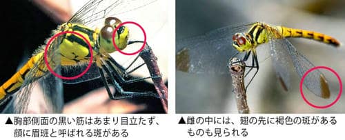 | マユタテアカネはやや小型の赤トンボで、顔には眉班と呼ばれる特徴な斑がある。 雌では成熟しても赤くならないが、成熟した雄の腹部は赤くなる。 マユタテアカネの分布域 マユタテアカネは、ロシアや中国、朝鮮半島や日本、台湾などに分布していて、国内では北海道から本州、四国、九州地方に分布している。 伊豆諸島や沖縄地方では見られないが、マユタテアカネはトカラ列島までは分布している。 マユタテアカネの大きさ・特徴 マユタテアカネは体長30~43mm程で、赤トンボ(アカネ属)の中ではやや小型になる。 雌雄ともに、顔の前額に眉班と呼ばれる一対の斑が見られるのが特徴になっていて、この斑が、「眉を立てたように見える」ことから「マユタテアカネ(眉立茜)」と名付けられている。る 但し、この斑の大きさにはやや個体差があり、ふたつの斑が接していて、ひとつに見えるものもある。 また、マユタテアカネの胸部側面に見られる黒い筋(翅胸第1側縫線)などは、他のアカネ属のものより細くて、あまり目立たないのも特徴になっている。 体色は、成熟前のものは雌雄ともに黄褐色のような色をしている。 成熟した雄は腹部は赤くなるが、胸は褐色のような色になる。 一方、雌では赤くならず、全体に暗いような色になるが、時には腹部背側が赤くなるものも見られる。 また、雌雄ともに翅は透明で、ふつう斑などは見られないが、雌の中には、翅の先にノシメトンボのような褐色の斑があるものが現れることもある。 マユタテアカネは、顔に眉班と呼ばれる斑があるのが特徴になっているが、マイコアカネやヒメアカネとはよく似ていて、それらの中にも眉班が見られることもある。 眉班以外の違いとしては、マユタテアカネの肩にある黒い筋(横から見ると前方の筋)は太くて一本になっているが、マイコアカネでは僅かに離れて黒い点があるようにも見え、胸の側面には4本の筋があるようにも見える。 また、マイコアカネの成熟した雄は青白い顔色をしている。 ヒメアカネとは眉斑がないことで見分けられるが、ヒメアカネにも中には僅かに斑が見られることもある。 その様な場合、マユタテアカネの雄の腹の先にある上付属器の先は、大きく上に曲がって反り返ったような形をしている。 雌では、腹部の先端下面にある産卵管が、ヒメアカネでは先端の腹側に長く突き出ているが、マユタテアカネの雌では尾部先端の突起(上付属器)よりも短く、幅広いなどの違いが見られる。 また、マユタテアカネの雌で翅の先に暗褐色の斑があるのものは、ノシメトンボやコノシメトンボ、リスアカネなどにも似た感じがするが、胸の側面を見ると、マユタテアカネでは、黒い筋が細く、はっきりとしていないので、すぐに分かる。