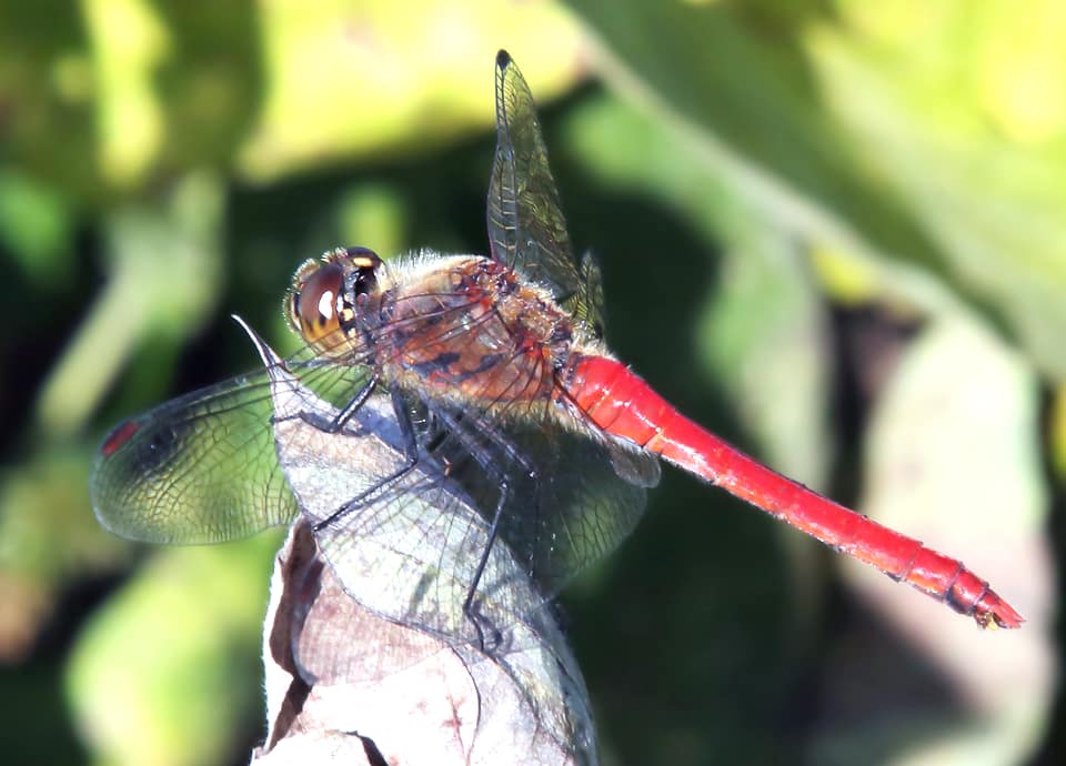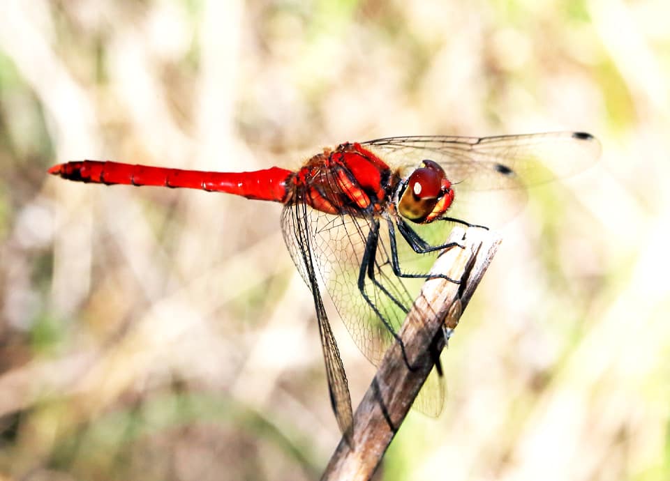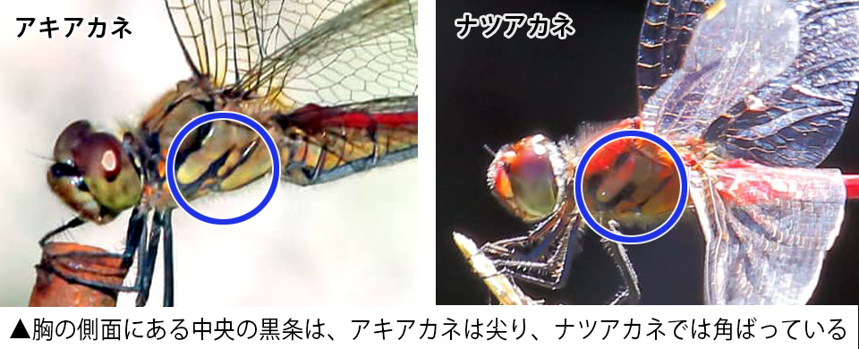 | ナツアカネは、夏でも見られる赤トンボと言われていて、国内では広く見られる。 成熟した雄は全体が赤くなり、アキアカネと共に、秋の風物詩になっている。 ナツアカネの分布域 ナツアカネは中国や朝鮮半島、日本や台湾などに分布していて、国内では北海道から本州、四国、九州地方に分布している。 沖縄地方の分布は分からないが、奄美大島辺りまでは分布している。 ナツアカネの大きさ・特徴 ナツアカネは全長34~43mmほどで、アキアカネと同じほどか、やや小さい。 体色は、雌雄ともに黄褐色のような色をしているが、雄は、成熟すると頭部や胸を含め、全体が赤くなり、複眼も赤っぽくなる。 雌は赤くならないが、中には腹部の背側が赤くなり、翅の基部が黄色っぽくなるものも見られる。 一見するとアキアカネとはよく似ているが、一般に、胸の側面にある中央の黒条を見ると、アキアカネでは先が尖ったようになっているが、ナツアカネの黒条の先は途中で切れたように角ばっているとされている。 また、アキアカネの雄は成熟しても頭部や胸は赤くならないが、ナツアカネの雄は全体が赤くなり、頭部や胸も赤くなる。 しかし、個体差があり、胸の側面にある黒条などは、どちらとも言えないようなものも見られるので、全体の様子から判断した方かがよい。 ナツアカネの成熟した雄は全体に赤くなってショウジョウトンボにも似ているが、ナツアカネの脚は黒いままだが、ショウジョウトンボは脚まで赤くなっているほか、翅の基部付近に赤い大きな斑がある。