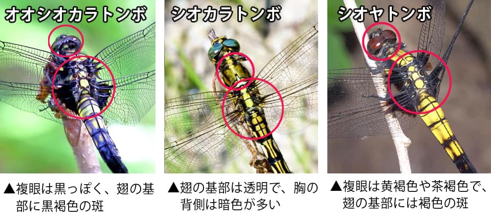 | オオシオカラトンボは、国内に広く分布していて、各地でふつうに見られる。 シオカラトンボとはよく似ているが、翅の基部に黒褐色の斑があるのが特徴になっている。 オオシオカラトンボの分布域 オオシオカラトンボは、ロシア極東地方や千島列島、中国東部や朝鮮半島、日本や台湾などに分布していて、ベトナム北部辺りにも分布していると言われている。 国内では、北海道から沖縄地方まで広く分布していて、各地で見られる。 オオシオカラトンボの大きさ・特徴 オオシオカラトンボは体長50~55mm、大きいものは60mm程で、シオカラトンボに比べると腹部が太く、全体にがっしりとした印象を受ける。 羽化して間もない雌雄はよく似ていて、腹部は黄色や淡い黄褐色のような色で黒っぽい斑があり、翅の基部は僅かに淡褐色の部分が見られる。 成熟すると、雄は暗い水色や灰青色で、粉を吹いたようになるが、雌は黄褐色のような色のままで、全体がやや強い色になる。 シオカラトンボの雌も同じような色合いをしていて、その様子から「ムギワラトンボ」と呼ばれることもあるが、オオシオカラトンボの雌も同じように呼ばれることがある。 また、雌雄ともに、成熟すると翅の基部にはっきりとした暗褐色から黒褐色の斑が見られるようになるのが特徴になっている。 一見すると、シオカラトンボとはよく似ているが、シオカラトンボの翅の基部には暗褐色の部分がなく、複眼も、オオシオカラトンボでは黒褐色のような色をしているが、シオカラトンボでは、雄の複眼は濃い水色のような色で、雌は淡い緑褐色から明るい緑色のような色をしている。 シオヤトンボとも似ているが、シオヤトンボの翅の基部は褐色だが、オオシオカラトンボの翅の基部は黒褐色のような色で黒色が強くなっている。 また、複眼も、シオヤトンボの雄は青っぽく、雌は黄褐色や茶褐色をしているほか、オオシオカラトンボの雄は、シオヤトンボとよりも全体に青みが強い。
