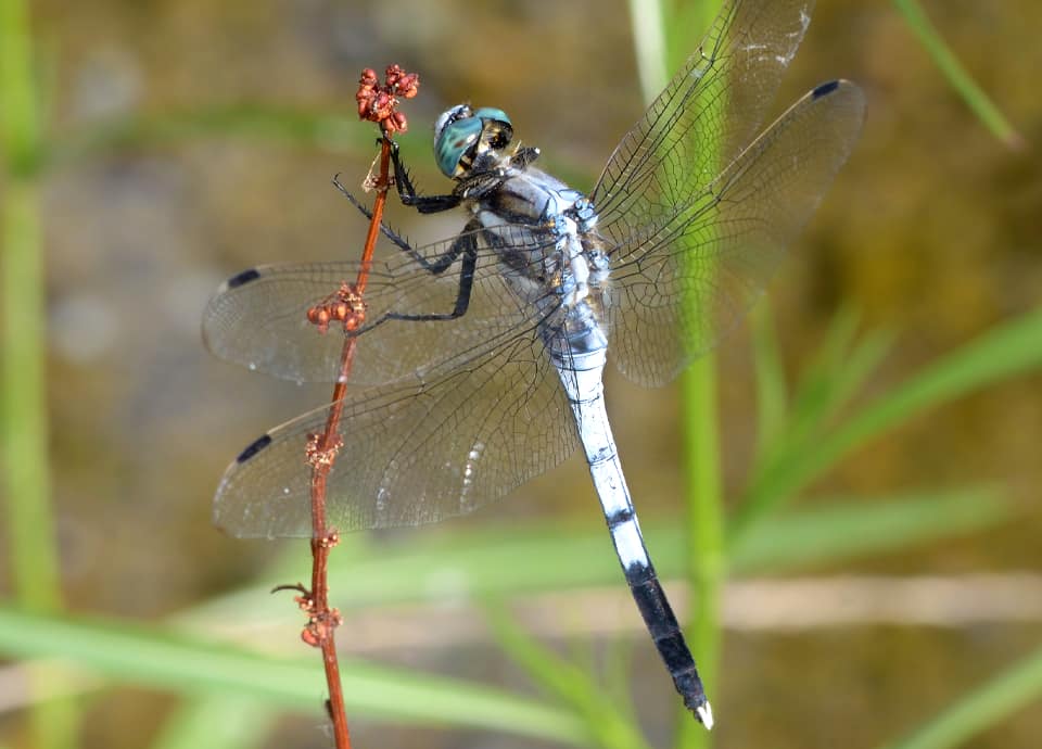 | シオカラトンボは各地でふつうに見られ、もっとも馴染みあるトンボのひとつとして親しまれている。 「シオカラ」の名前は、成熟した雄の体色の様子から付けられているが、雌は雄の体色とは異なっていて、「ムギワラトンボ」と呼ばれることもある。 シオカラトンボの分布域 シオカラトンボはユーラシアに広く分布しているが、国内でも、北海道から九州、沖縄地方まで広く分布している。 各地でふつうに見られ、湖沼や湿地、河川やため池など、主に低地から低山地にかけてのさまざまな環境に生息している。 シオカラトンボの大きさ・特徴 シオカラトンボは体長50~55mm程で、成熟すると雌雄で体色などが異なっている。 未成熟な内は、雌雄ともに腹部が黄色く、黒い斑があり、その様子から「ムギワラトンボ」と呼ばれることもある。 成長した雄は全体に水色をしているが、成熟すると黒っぽくなり、胸部から腹部前方にかけて白い粉(塩)を吹いたようになる。 その様子から「シオカラ」の名前が付けられているが、雌の体色はそれほど変わらない。 しかし、時には雄と同じような色の雌が現れることもある。 シオカラトンボは一見するとオオシオカラトンボとよく似ているが、オオシオカラトンボの翅の基部には暗褐色から黒褐色の黒っぽい斑があるが、シオカラトンボの翅の基部には斑などが見られない。 また、オオシオカラトンボの複眼は黒っぽい色をしているが、シオカラトンボでは、雄の複眼は青く、雌は緑色のような色をしている。 シオヤトンボとも似ているが、シオヤトンボにも翅の基部には褐色の斑があるほか、成熟したシオヤトンボの雄の腹部は先端部だけが黒くなる。 雌では、シオヤトンボの胸は上面が黄色っぽ色をしているが、シオカラトンボの雌では暗色の部分が多くなっているなどの違いが見られる。